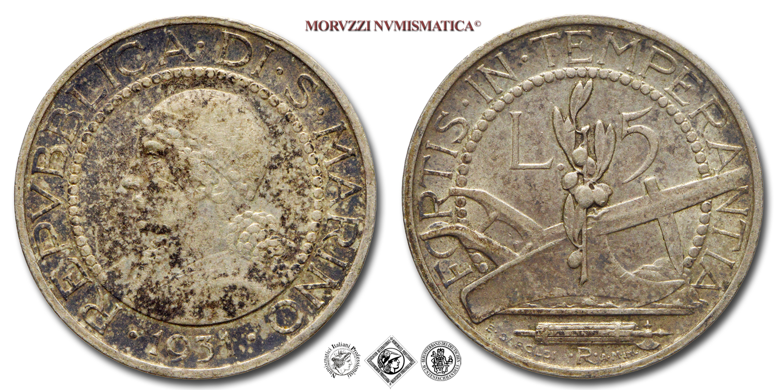 San Marino, REPUBBLICA, Vecchia Monetazione, 1864-1938, LIRE 5, Emissione: 1931, D/ all'interno di un cerchio di perline, busto di donna volto a sinistra. Intorno, REPVBBLICA • DI • S • MARINO e millesimo (1931) tra due •, R/ all'interno di un cerchio di perline, aratro sormontato da un ramo d'ulivo e indicazione del valore (L • 5). Intorno, FORTIS • IN • TEMPERANTIA. In esergo, fascio con scure posto in orizzontale al di sotto del quale si trova l'indicazione del segno di zecca (R) posto tra E • SAROLDI e A • M • INC •, Zecca di Roma, Rif. bibl. Pagani, 358; Metallo: AR, gr. 5,03, (MZ100074), Diam.: mm. 23,12, SPL