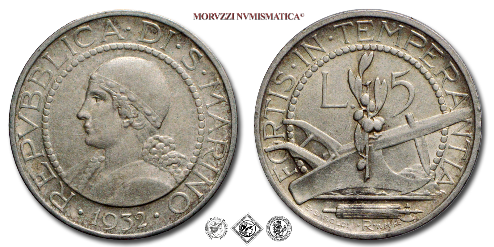 San Marino, REPUBBLICA, Vecchia Monetazione, 1864-1938, LIRE 5, Emissione: 1932, D/ all'interno di un cerchio di perline, busto di donna volto a sinistra. Intorno, REPVBBLICA • DI • S • MARINO e millesimo (1932) tra due •, R/ all'interno di un cerchio di perline, aratro sormontato da un ramo d'ulivo e indicazione del valore (L • 5). Intorno, FORTIS • IN • TEMPERANTIA. In esergo, fascio con scure posto in orizzontale al di sotto del quale si trova l'indicazione del segno di zecca (R) posto tra E • SAROLDI e A • M • INC •, Zecca di Roma, Rif. bibl. Pagani, 359; Metallo: AR, gr. 4,99, (MZ155645), Diam.: mm. 23,12, SPL