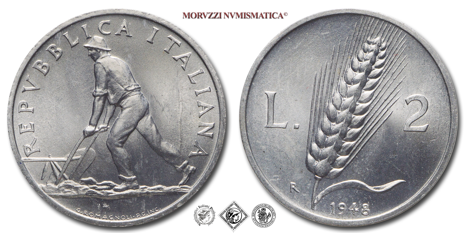 Italia, REPUBBLICA, Dal 1946, 2 LIRE, Spiga, Emissione: 1948, D/ agricoltore che spinge un aratro verso s., lungo il bordo REPVBBLICA ITALIANA, in esergo indicazione dell'autore G. ROMAGNOLI e dell'incisore P. G. INC •, R/ spiga di grano con foglia inclinata verso d. in mezzo all'indicazione del valore (L. 2), sotto la foglia, in basso, indicazione del millesimo (1948), lungo il bordo segno di zecca (R), Zecca di Roma, Rif. bibl. Pagani, 2403; Metallo: IT, gr. 1,76, (MI152300), Diam.: mm. 23,98, FDC