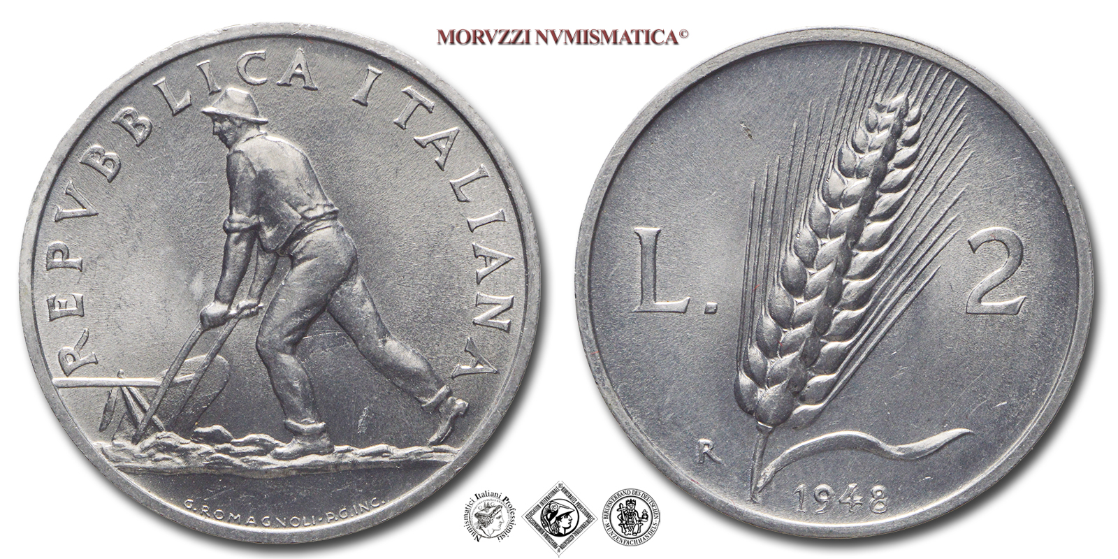 Italia, REPUBBLICA, Dal 1946, 2 LIRE, Spiga, Emissione: 1948, D/ agricoltore che spinge un aratro verso s., lungo il bordo REPVBBLICA ITALIANA, in esergo indicazione dell'autore G. ROMAGNOLI e dell'incisore P. G. INC •, R/ spiga di grano con foglia inclinata verso d. in mezzo all'indicazione del valore (L. 2), sotto la foglia, in basso, indicazione del millesimo (1948), lungo il bordo segno di zecca (R), Zecca di Roma, Rif. bibl. Pagani, 2403; Metallo: IT, gr. 1,75, (MI152296), Diam.: mm. 23,98, FDC