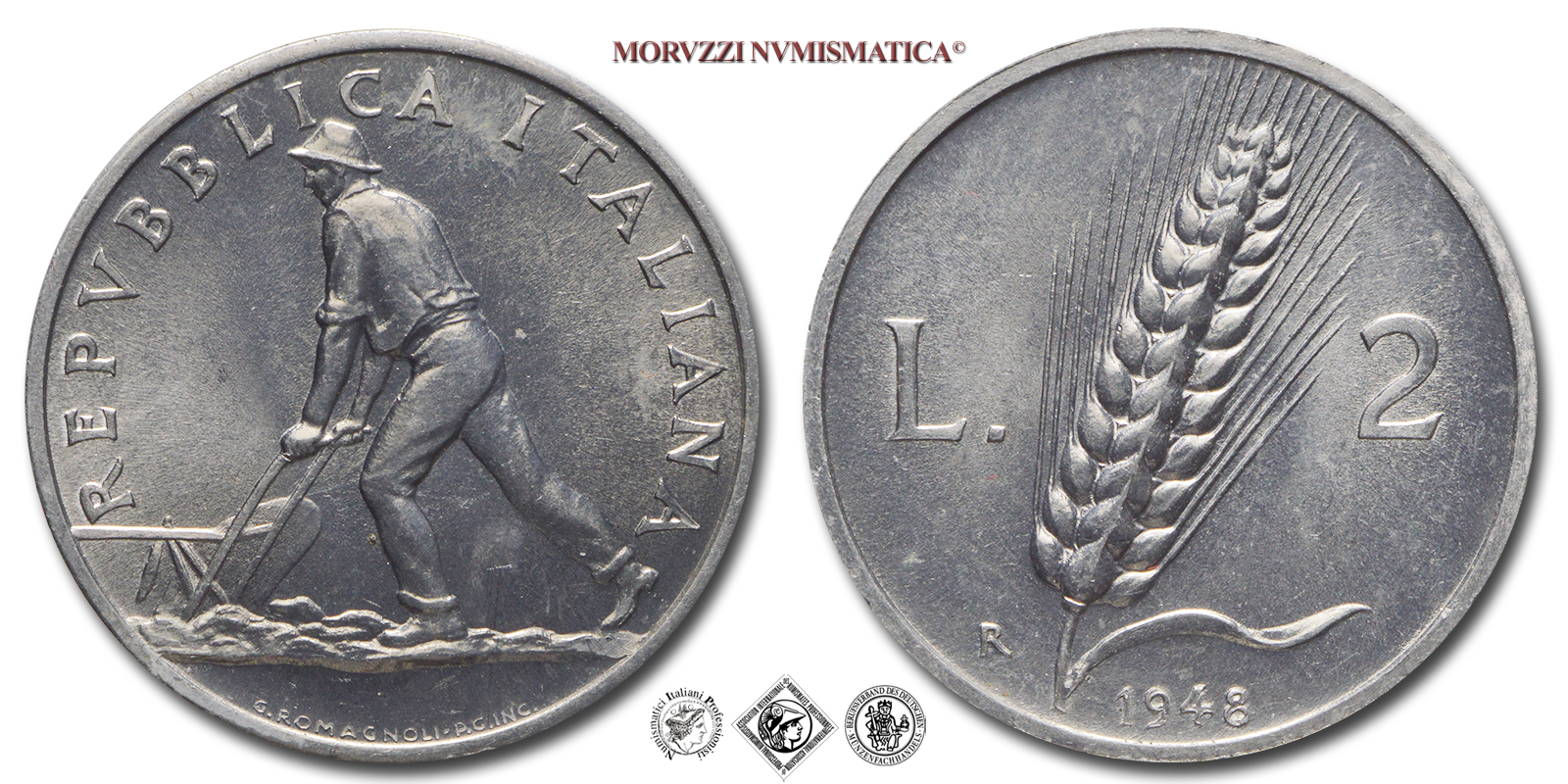 Italia, REPUBBLICA, Dal 1946, 2 LIRE, Spiga, Emissione: 1948, D/ agricoltore che spinge un aratro verso s., lungo il bordo REPVBBLICA ITALIANA, in esergo indicazione dell'autore G. ROMAGNOLI e dell'incisore P. G. INC •, R/ spiga di grano con foglia inclinata verso d. in mezzo all'indicazione del valore (L. 2), sotto la foglia, in basso, indicazione del millesimo (1948), lungo il bordo segno di zecca (R), Zecca di Roma, Rif. bibl. Pagani, 2403; Metallo: IT, gr. 1,75, (MI152298), Diam.: mm. 23,98, FDC