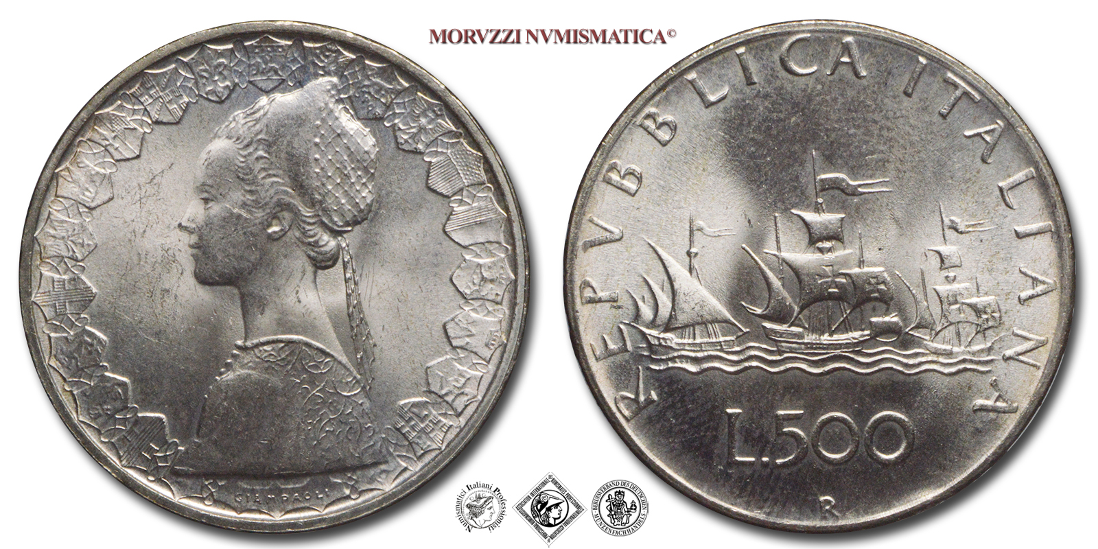 Italia, REPUBBLICA, Dal 1946, LIRE 500, Caravelle, Emissione: 1961, D/ busto di donna in abiti rinascimentali. Lungo il bordo gli stemmi di diciannove tra regioni o capoluoghi di Regione (si intravedono altri stemmi coperti dal busto di donna e quindi inintellegibili). In basso indicazione dell'autore (GIAMPAOLI), R/ tre caravelle con la prua rivolta a destra e le punte delle bandiere verso la prua. Intorno REPVBBLICA ITALIANA. Sotto le caravelle indicazione del valore (L.500). In basso segno di zecca (R), Zecca di Roma, Rif. bibl. Pagani, 2104; Metallo: AR, gr. 10,96, (MI159803), Diam.: mm. 29,50, qFDC