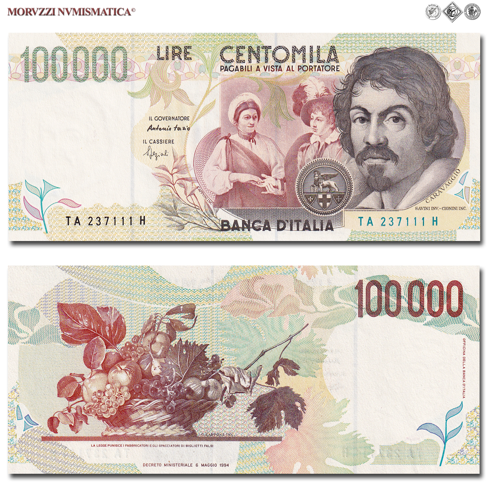 Italia, Repubblica, BANCA D'ITALIA, 100000 LIRE, Caravaggio II tipo - Serie A, 12.05.1994, D/ sulla destra, testa di Michelangelo Merisi da Caravaggio. Sullo sfondo, al centro, rappresentazione di un particolare del dipinto "Buona Ventura". Dipinto custodito al Louvre di Parigi, R/ sulla sinistra particolare del dipinto "Canestra di frutta". Dipinto custodito nella Pinacoteca Ambrosiana di Milano, Rif. bibl. Crapanzano, 626; (CM154639), Firme: Fazio, Speziali, n° di serie: TA 237111 H, FDS
