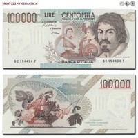 Italia, Repubblica, BANCA D'ITALIA, 100000 LIRE, Caravaggio II tipo - Serie A, 12.05.1994, D/ sulla destra, testa di Michelangelo Merisi da Caravaggio. Sullo sfondo, al centro, rappresentazione di un particolare del dipinto "Buona Ventura". Dipinto custodito al Louvre di Parigi, R/ sulla sinistra particolare del dipinto "Canestra di frutta". Dipinto custodito nella Pinacoteca Ambrosiana di Milano, Rif. bibl. Crapanzano, 626; (CM154641), Firme: Fazio, Speziali, n° di serie: TA 237113 H, FDS