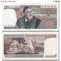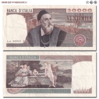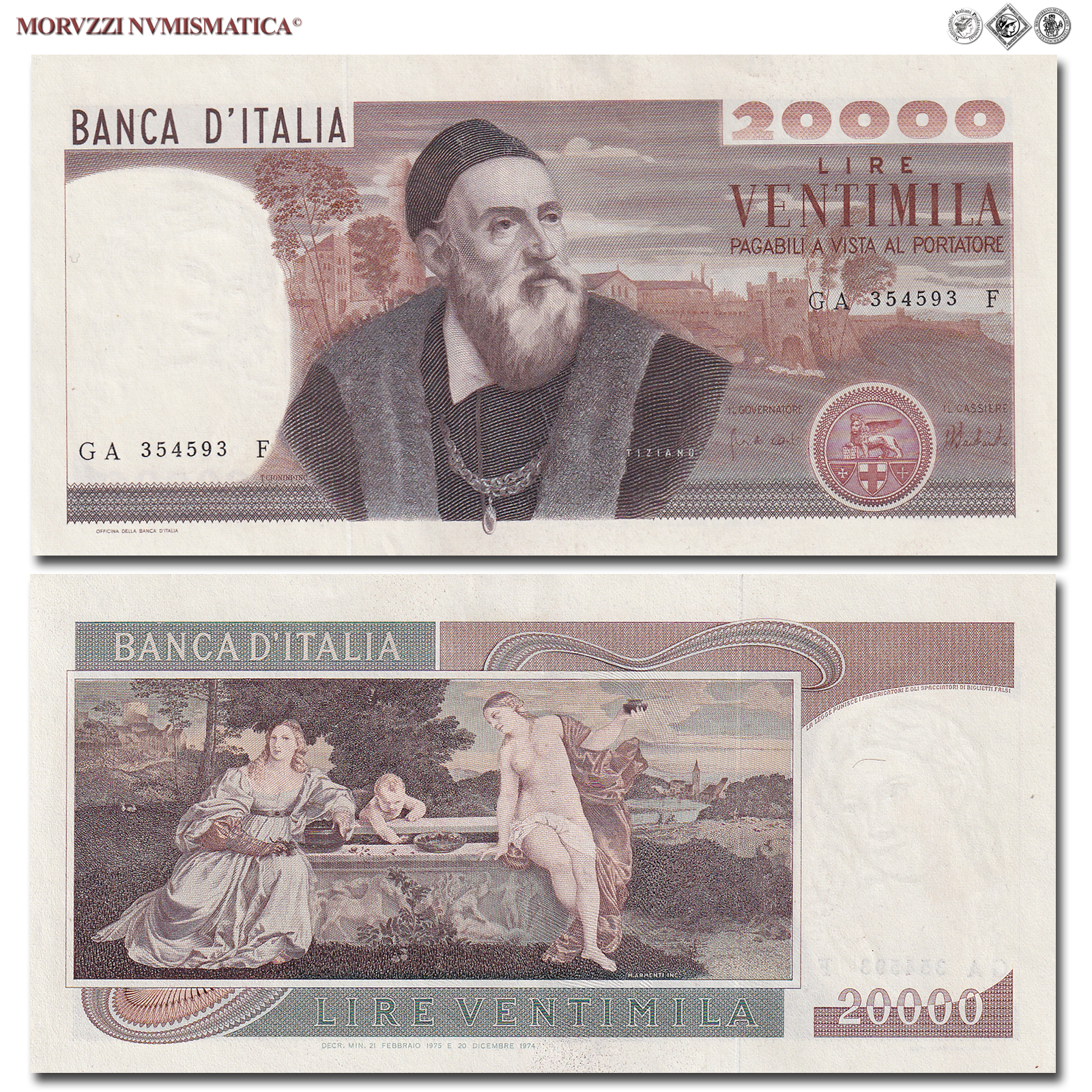 Italia, Repubblica, BANCA D'ITALIA, LIRE 20000, Tiziano, 21.02.1975, D/ busto di Tiziano Vecellio, ispirato all'autoritratto conservato presso la Galleria degli Uffizi di Firenze. Alle spalle un paesaggio dipinto da Tiziano in uno degli affreschi della Scuola del Santo ("Miracolo del piede risanato"), nella basilica di Sant'Antonio a Padova, R/ riproduzione del dipinto "Amor Sacro e Amor Profano" del Tiziano, conservato nella Galleria Borghese in Roma, Rif. bibl. Crapanzano, 594; (CM162796), Firme: Carli, Barbarito, n° di serie: GA 354593 F, FDS