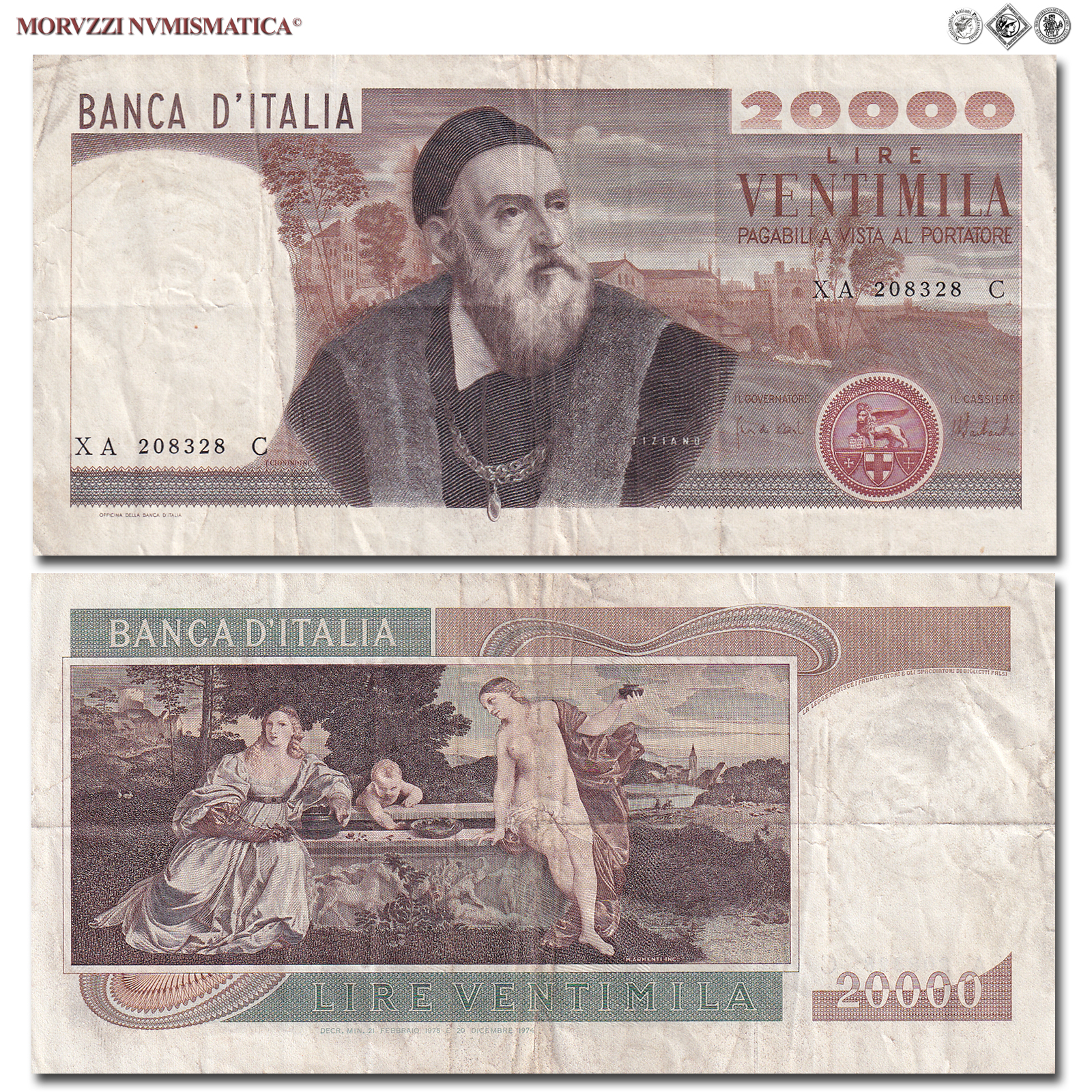 Italia, Repubblica, BANCA D'ITALIA, LIRE 20000, Tiziano - serie speciale, 21.02.1975, D/ busto di Tiziano Vecellio, ispirato all'autoritratto conservato presso la Galleria degli Uffizi di Firenze. Alle spalle un paesaggio dipinto da Tiziano in uno degli affreschi della Scuola del Santo ("Miracolo del piede risanato"), nella basilica di Sant'Antonio a Padova, R/ riproduzione del dipinto "Amor Sacro e Amor Profano" del Tiziano, conservato nella Galleria Borghese in Roma, Rif. bibl. Crapanzano, 594s; (CM11451), Firme: Carli, Barbarito, n° di serie: XA 208328 C, mBB, (RRR)