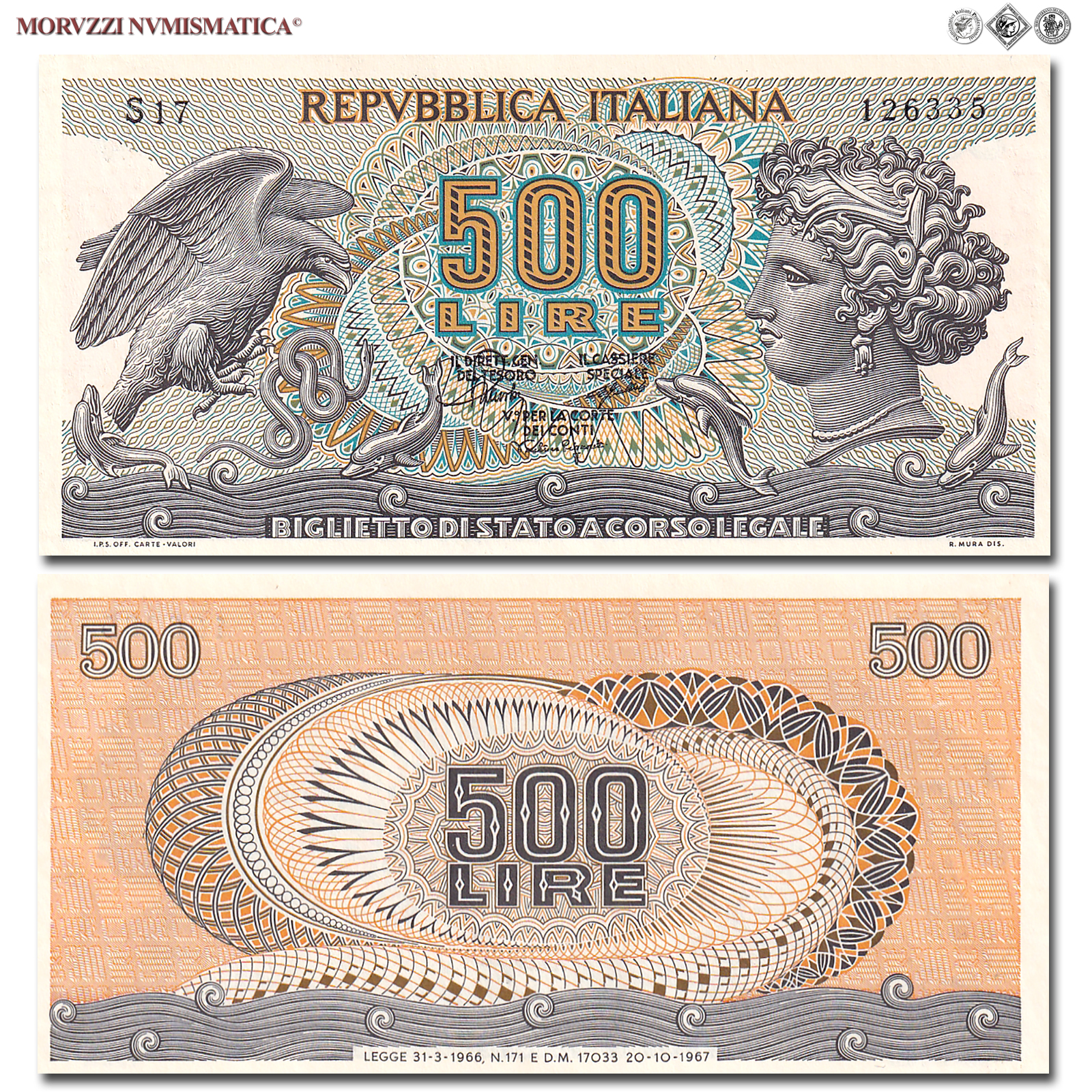 Italia, Repubblica, BIGLIETTO DI STATO, LIRE 500, Aretusa, 20.06.1966, D/ nella destra ninfa Aretusa, nella sinistra aquila che ghermisce serpente e delfini uscenti dalle acque, R/ al centro "500 LIRE", in due righe, entro disegni geometrici, Rif. bibl. Crapanzano, BS58; (CM162794), Firme: Stammati, Gubbels, Ventura Signoretti, n° di serie: S17 126335, FDS