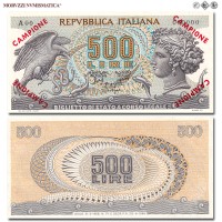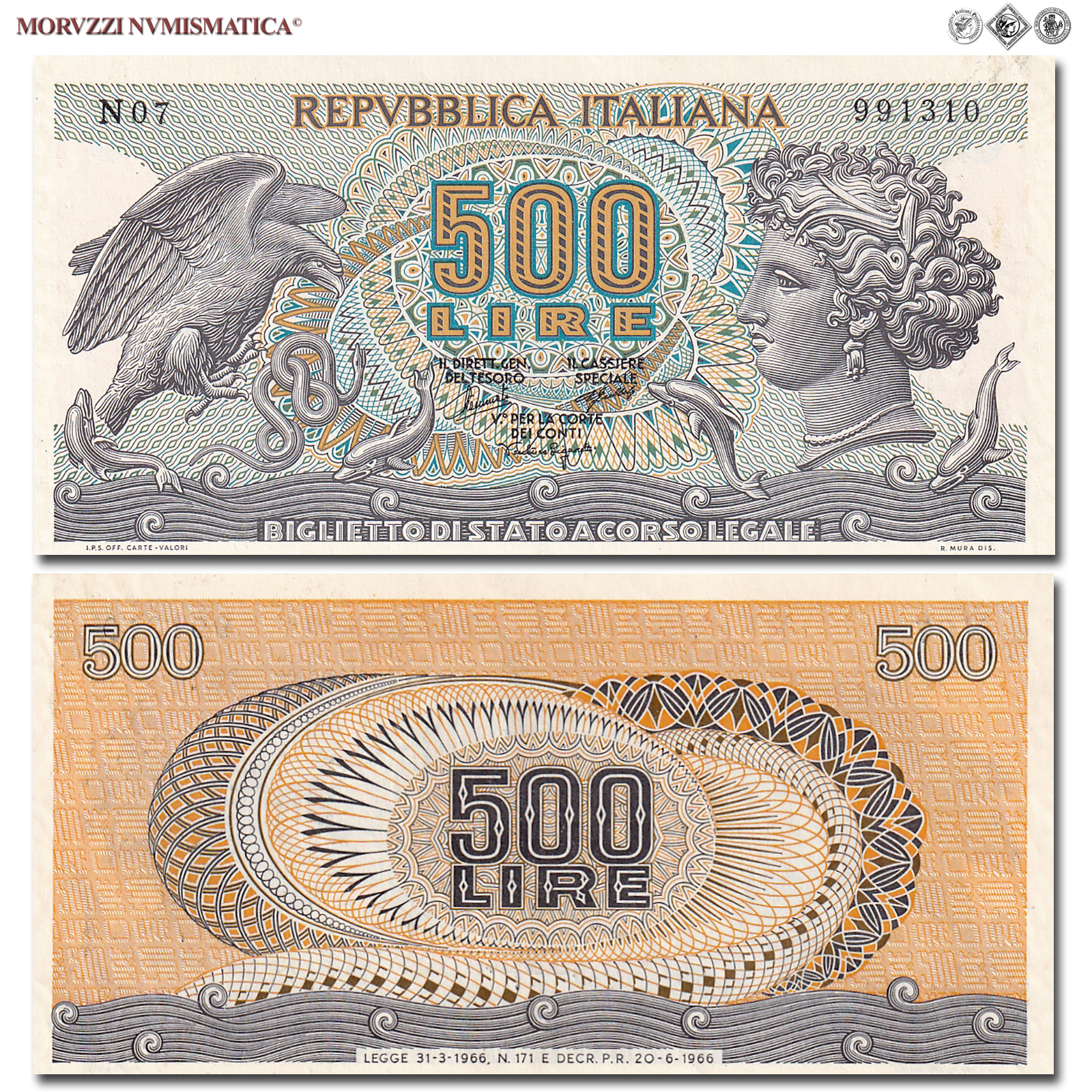 Italia, Repubblica, BIGLIETTO DI STATO, LIRE 500, Aretusa, 20.06.1966, D/ nella destra ninfa Aretusa, nella sinistra aquila che ghermisce serpente e delfini uscenti dalle acque, R/ al centro "500 LIRE", in due righe, entro disegni geometrici, Rif. bibl. Crapanzano, BS58; (CM162792), Firme: Stammati, Gubbels, Ventura Signoretti, n° di serie: N07 991310, FDS