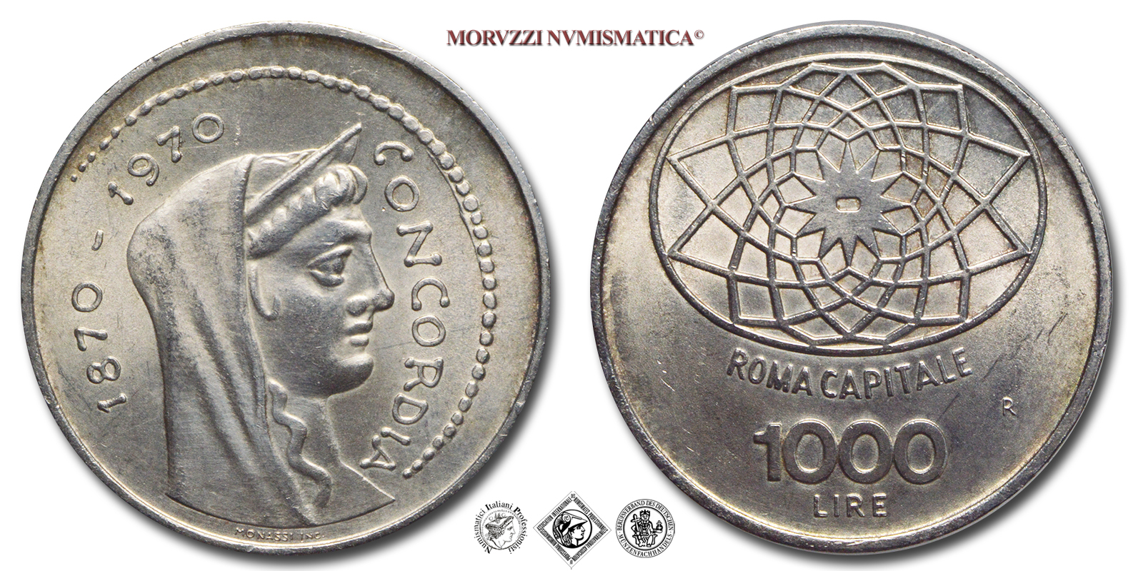 Italia, REPUBBLICA, Dal 1946, LIRE 1000, Centenario di Roma Capitale 1870-1970, Emissione: 1970, D/ testa velata della Dea Concordia a d.; intorno, lungo un cerchio di perline: 1870-1970 CONCORDIA, R/ nella parte superiore: disegno della pavimentazione michelangiolesca antistante il Campidoglio; nella parte inferiore, su tre righe: ROMA CAPITALE 1000 LIRE; a d.: il segno di zecca (R), Zecca di Roma, Rif. bibl. Pagani, 2051; Metallo: AR, gr. 14,59, (MI160889), Diam.: mm. 31,43, qFDC