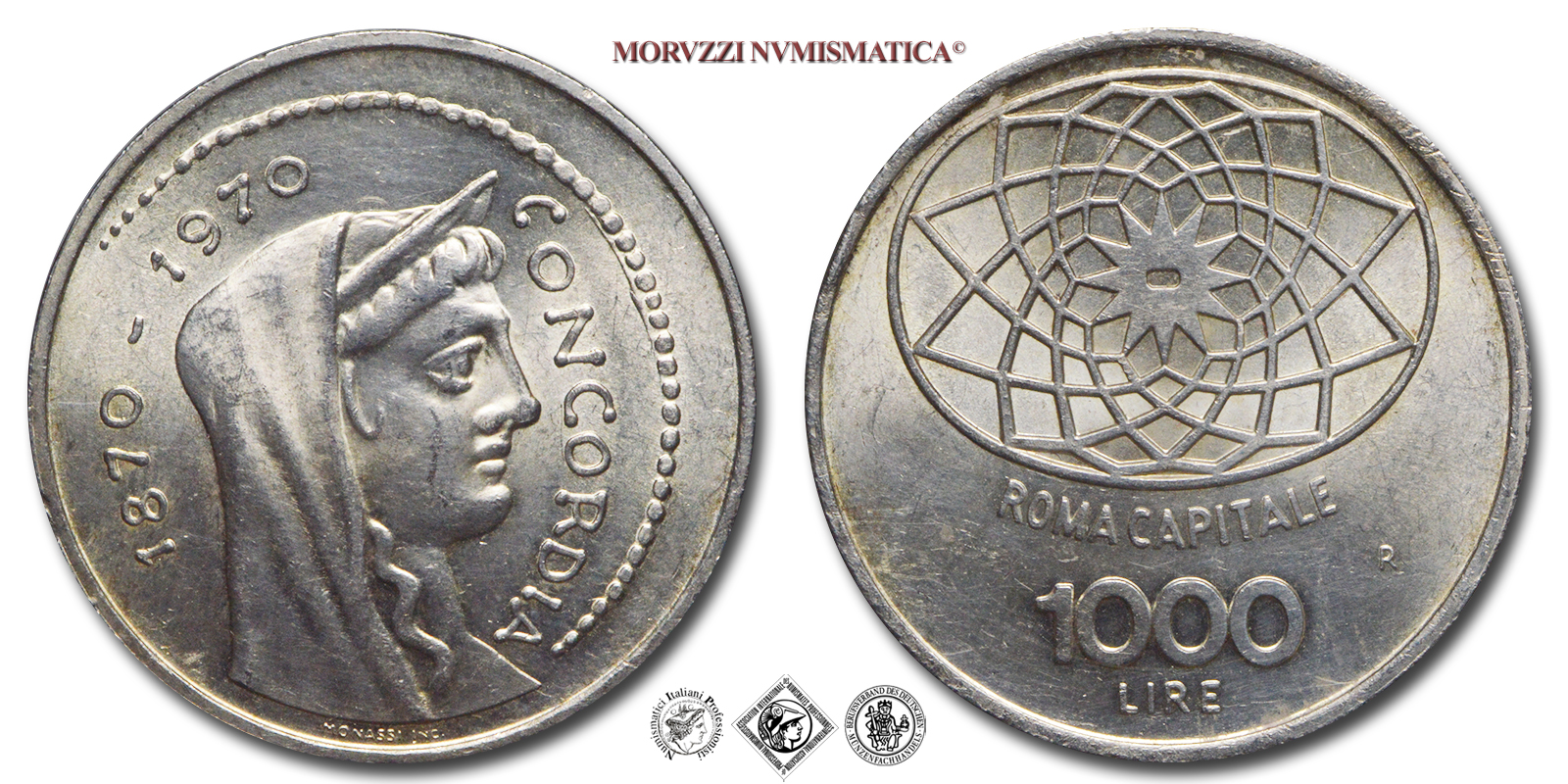 Italia, REPUBBLICA, Dal 1946, LIRE 1000, Centenario di Roma Capitale 1870-1970, Emissione: 1970, D/ testa velata della Dea Concordia a d.; intorno, lungo un cerchio di perline: 1870-1970 CONCORDIA, R/ nella parte superiore: disegno della pavimentazione michelangiolesca antistante il Campidoglio; nella parte inferiore, su tre righe: ROMA CAPITALE 1000 LIRE; a d.: il segno di zecca (R), Zecca di Roma, Rif. bibl. Pagani, 2051; Metallo: AR, gr. 14,54, (MI160887), Diam.: mm. 31,52, FDC