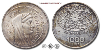 Italia, REPUBBLICA, Dal 1946, LIRE 1000, Centenario di Roma Capitale 1870-1970, Emissione: 1970, D/ testa velata della Dea Concordia a d.; intorno, lungo un cerchio di perline: 1870-1970 CONCORDIA, R/ nella parte superiore: disegno della pavimentazione michelangiolesca antistante il Campidoglio; nella parte inferiore, su tre righe: ROMA CAPITALE 1000 LIRE; a d.: il segno di zecca (R), Zecca di Roma, Rif. bibl. Pagani, 2051; Metallo: AR, gr. 14,58, (MI158001), Diam.: mm. 31,48, FDC