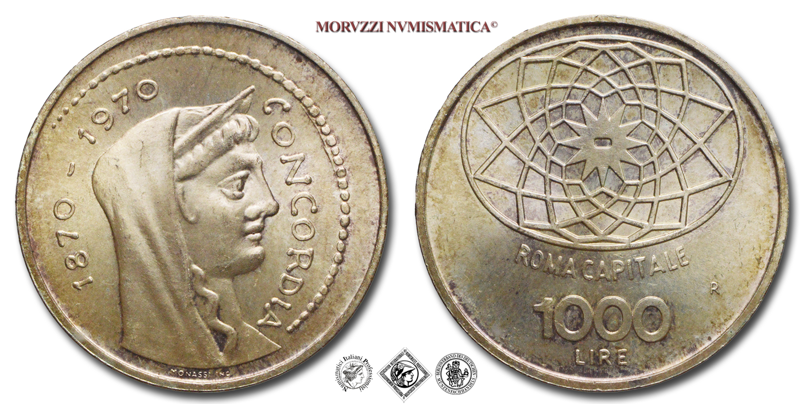 Italia, REPUBBLICA, Dal 1946, LIRE 1000, Centenario di Roma Capitale 1870-1970, Emissione: 1970, D/ testa velata della Dea Concordia a d.; intorno, lungo un cerchio di perline: 1870-1970 CONCORDIA, R/ nella parte superiore: disegno della pavimentazione michelangiolesca antistante il Campidoglio; nella parte inferiore, su tre righe: ROMA CAPITALE 1000 LIRE; a d.: il segno di zecca (R), Zecca di Roma, Rif. bibl. Pagani, 2051; Metallo: AR, gr. 14,63, (MI155799), Diam.: mm. 31,44, FDC