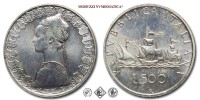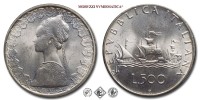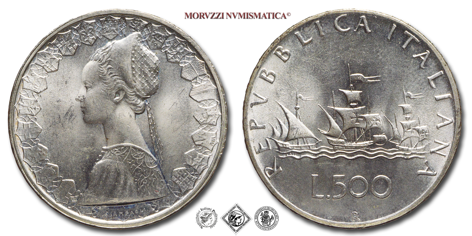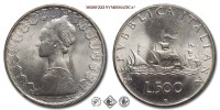 Italia, REPUBBLICA, Dal 1946, LIRE 500, Caravelle, Emissione: 1966, D/ busto di donna in abiti rinascimentali. Lungo il bordo gli stemmi di diciannove tra regioni o capoluoghi di Regione (si intravedono altri stemmi coperti dal busto di donna e quindi inintellegibili). In basso indicazione dell'autore (GIAMPAOLI), R/ tre caravelle con la prua rivolta a destra e le punte delle bandiere verso la prua. Intorno REPVBBLICA ITALIANA. Sotto le caravelle indicazione del valore (L.500). In basso segno di zecca (R), Zecca di Roma, Rif. bibl. Pagani, 2107; Metallo: AR, gr. 10,97, Diam.: mm. 29,46, FDC