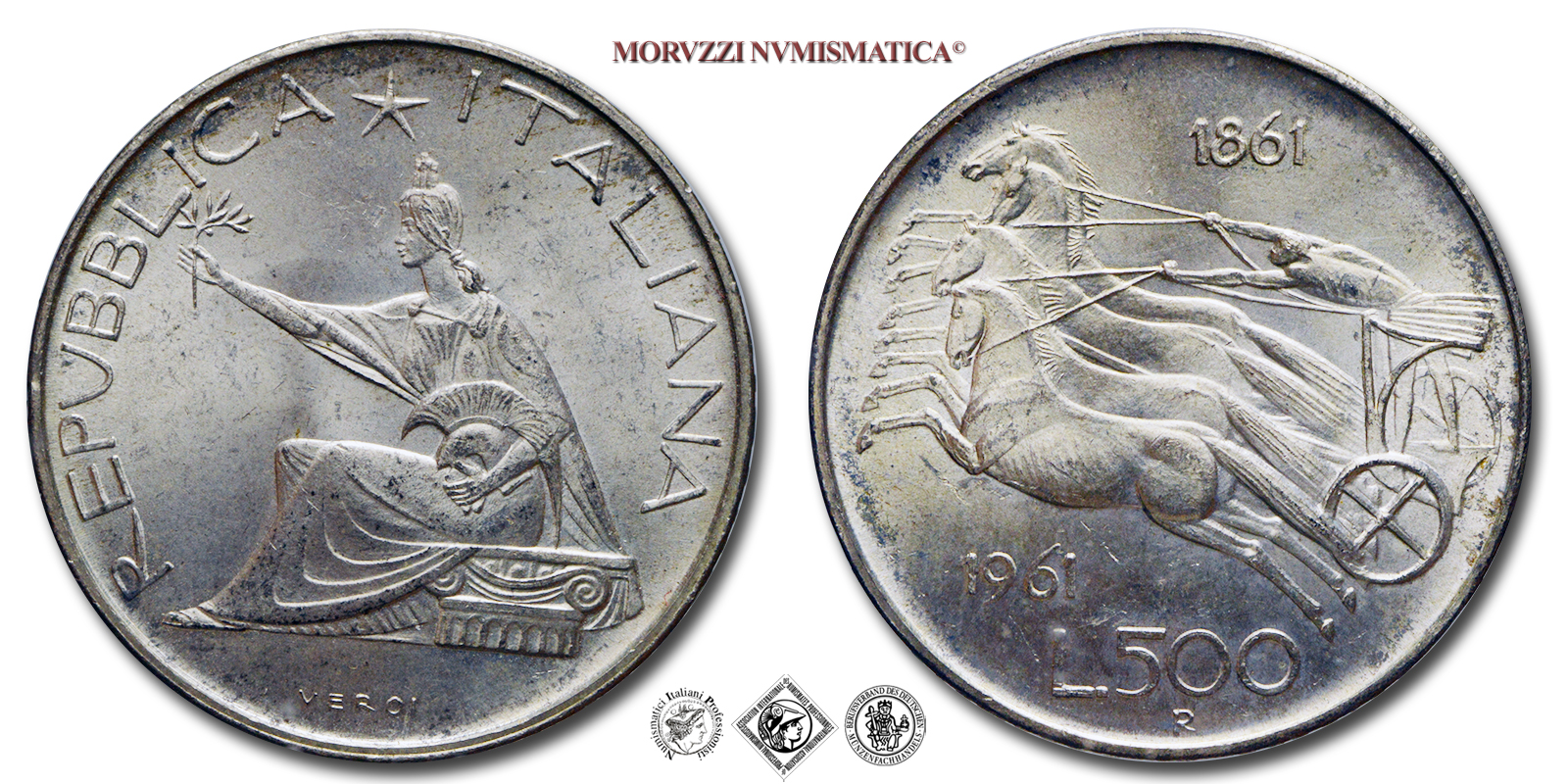 Italia, REPUBBLICA, Dal 1946, LIRE 500, Centenario Unità d'Italia, Emissione: 1961, D/ Figura di donna (allegoria dell'Italia) seduta verso sinistra su di un capitello ionico che con la mano sinistra regge un elmo al fianco e con la destra porge un ramoscello di ulivo. Intorno, lungo il bordo, REPUBBLICA, una stella a cinque punte, ITALIANA. In esergo indicazione dell'autore (VEROI), R/ Quadriga rivolta a sinistra tra le date 1961 (in basso leggermente a sinistra) e 1861 (in alto leggermente a destra). In basso, indicazione del valore (L. 500) sotto al quale si trova il segno di zecca (R), Zecca di Roma, Rif. bibl. Pagani, 2145; Metallo: AR, gr. 11,00, (MI143630), Diam.: mm. 29,00, FDC