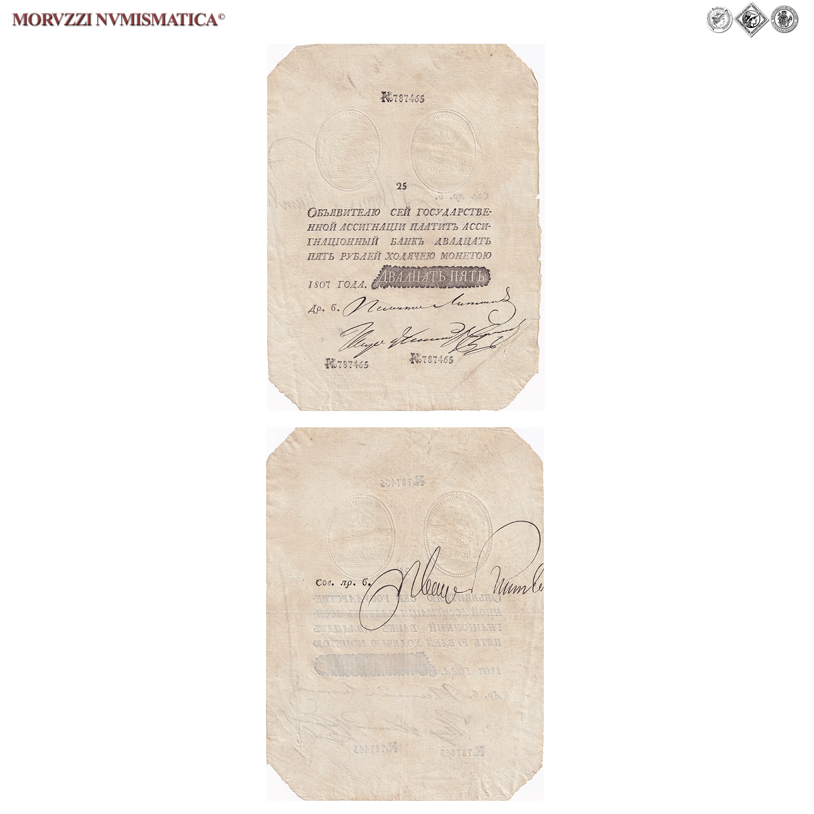 Russia, ALESSANDRO I, RUBLI 25, Napoleonic Forgery, 1807, D/ Testo senza cornice, 2 firme autografe. Scritta: 25 / Объявителю сей государстве- / нной ассигнацiи платитъ асси- / гнационный банкъ двадцать / пять рублей ходячею монетою / 1807 года. Двадцать пять / Др. б., R/ Una firma autografa. Scritta: Сов. Др. б., (CM111540), n° di serie: 787465, SPL, (RRR)
