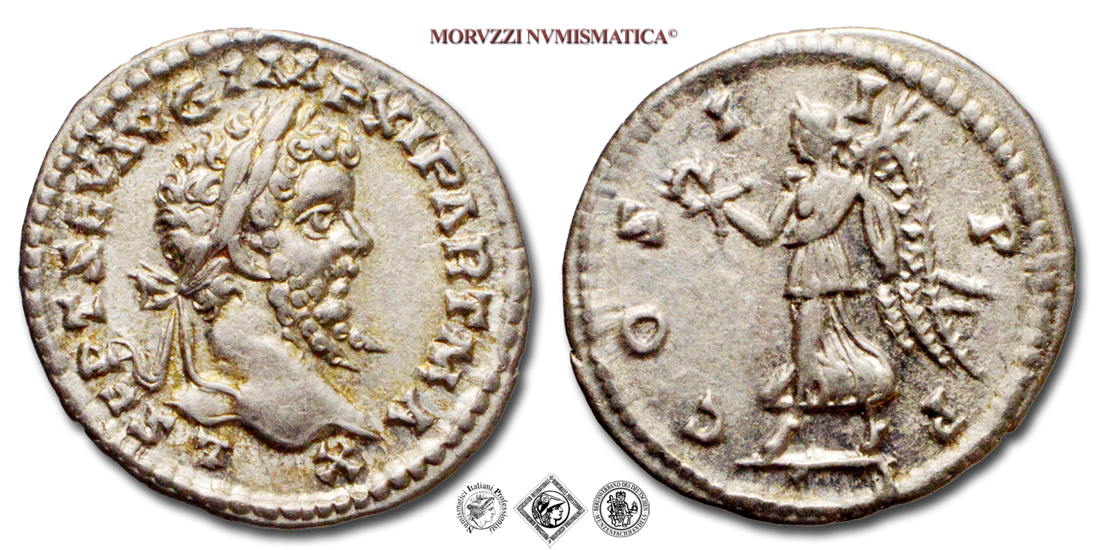 Impero Romano, SETTIMIO SEVERO, 193-211 d.C., DENARIO, Emissione: 198-202 d.C., D/ L SEPT SEV AVG IMP XI PART MAX, testa laureata a d., R/ COS II P P, la Vittoria incedente verso s. tiene una corona nella mano d. ed un ramo di palma nella s., Zecca di Laodicea, Rif. bibl. R.I.C., 503a; Cohen, 96; Metallo: AR, gr. 2,95, (MR163102), Diam.: mm. 19,02, SPL