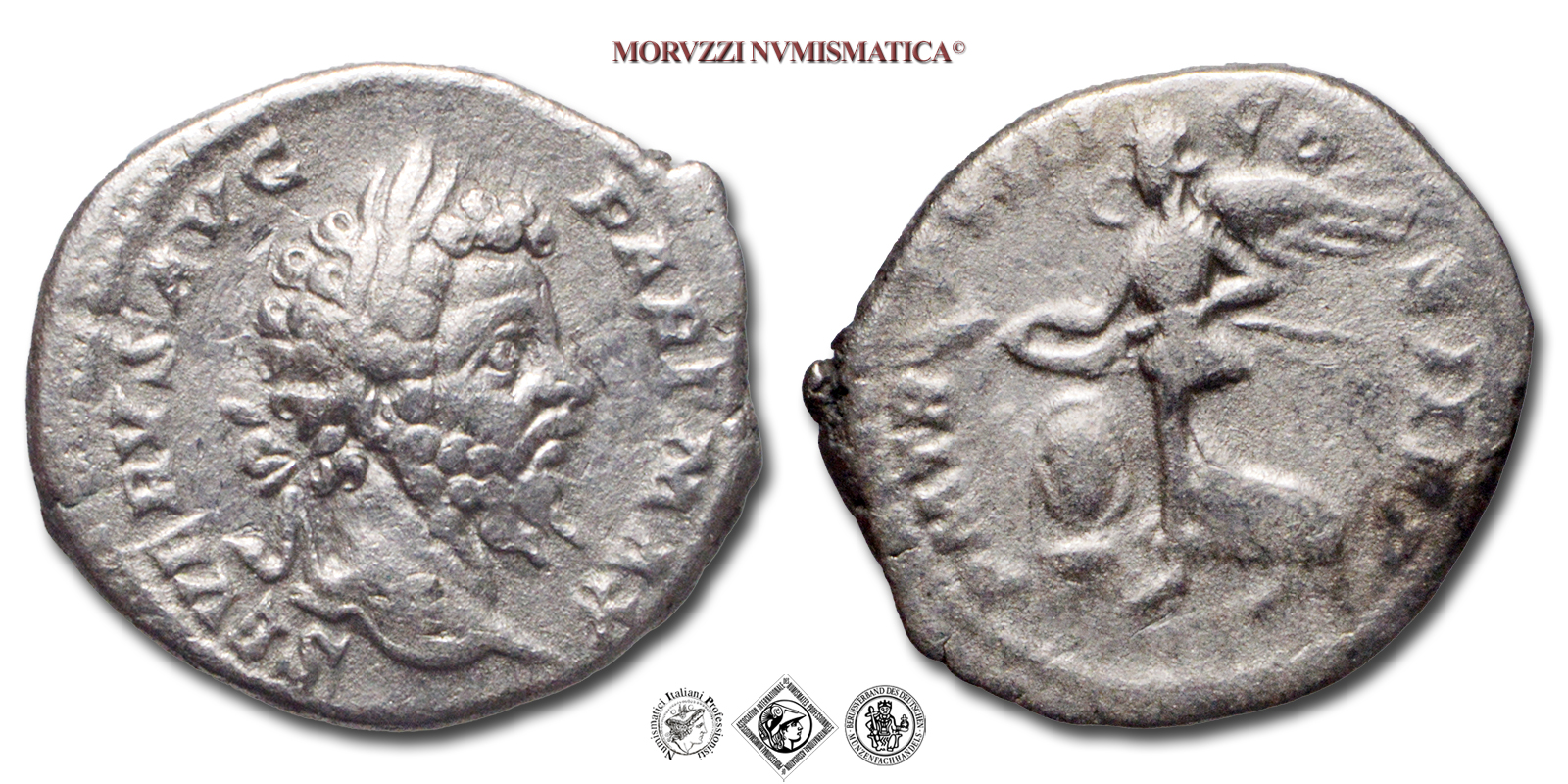 Impero Romano, SETTIMIO SEVERO, 193-211 d.C., DENARIO, Emissione: 200 d.C., D/ SEVERVS AVG PARTH MAX, testa laureata a destra, R/ P M TR P VIII COS II P P, la Vittoria andante verso sinistra, tiene un diadema in entrambe le mani; davanti a lei, uno scudo su un cippo, Zecca di Roma, Rif. bibl. R.I.C., 150; Cohen, 454; Metallo: AR, gr. 3,02, (MR162932), Diam.: mm. 19,12, MB