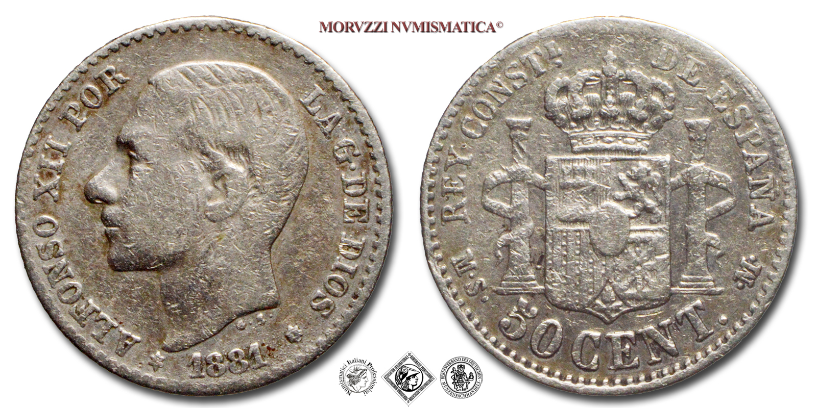 Spagna, ALFONSO XII, 1874-1885, CENTESIMI 50, Emissione: 1881, D/ ALFONSO XII POR LA G· DE DIOS G· S· * 1881 *, testa nuda del re Alfonso XII rivolta a sinistra. Incisore: Gregorio Sellán González, R/ REY CONSTL. DE ESPAÑA PLUS ULTRA M·S· 50 CENT ·M·, stemma coronato della Spagna con colonne d'Ercole. Incisore: Gregorio Sellán González, Zecca di Madrid, Rif. bibl. KM, 685; Calicò, 12; Metallo: AR, gr. 2,43, (ME161437), Diam.: mm. 18,20, BB