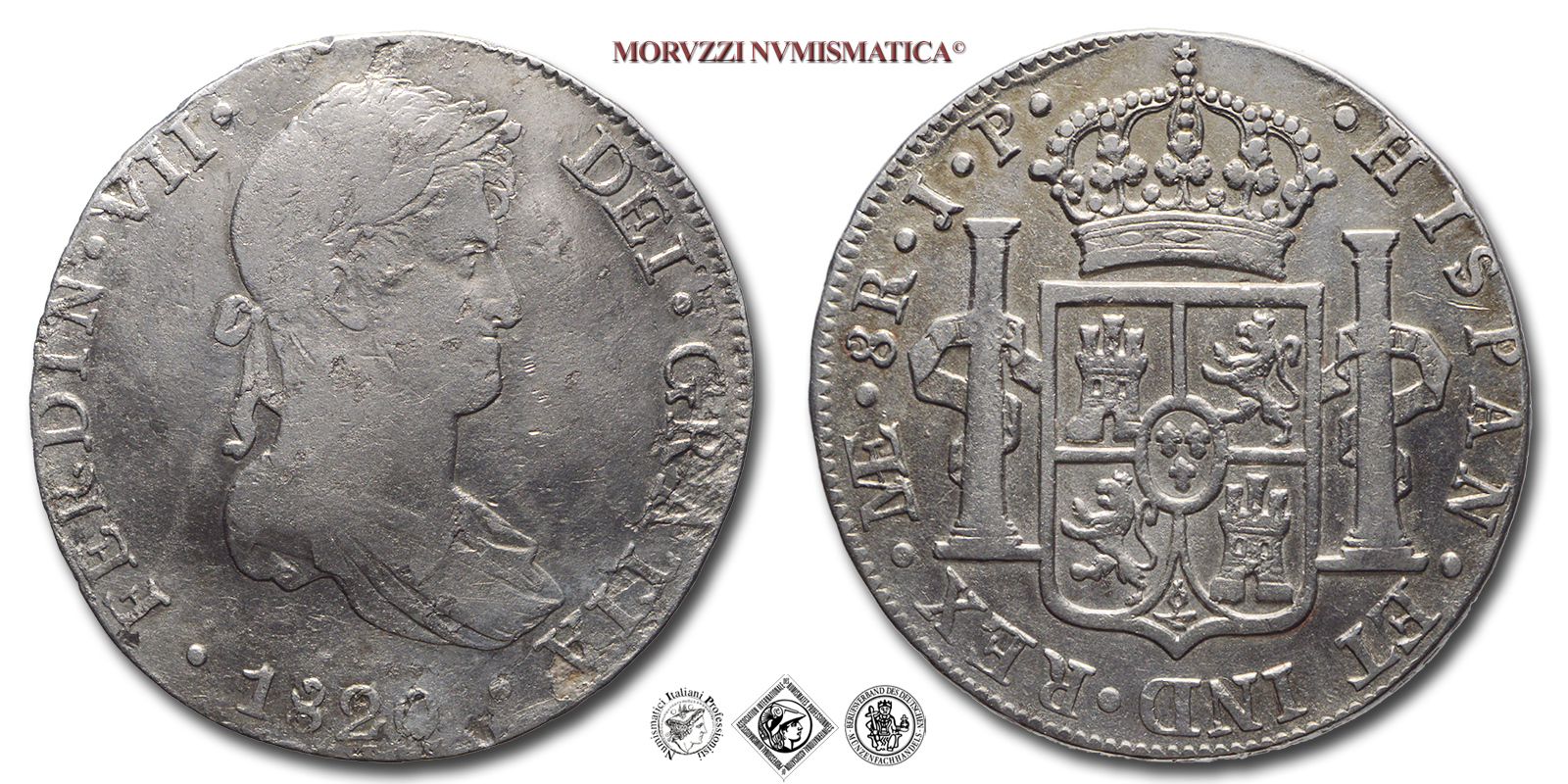 Spagna, Perù, FERDINANDO VII, 1808-1833, REALES 8, Emissione: 1820 MAE, D/ FERDIN • VII • DEI • GRATIA, busto laureato e drappeggiato a destra, data (• 1820 •) in basso, R/ • HISPAN • ET IND • REX • MAE • 8R • J • P •, stemma coronato tra colonne d'Ercole, Zecca di Lima, Rif. bibl. Calicò, 488; Metallo: AR, gr. 26,31, (ME157908), Diam.: mm. 37,75, qBB