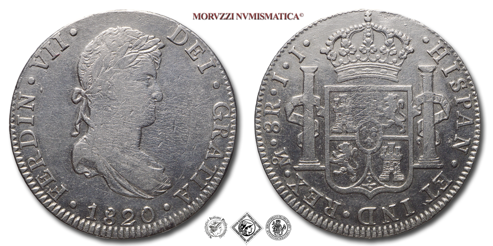 Spagna, FERDINANDO VII, 1808-1833, REALES 8, Emissione: 1820 Mo, D/ FERDIN • VII • DEI • GRATIA, busto laureato e drappeggiato a destra, data (• 1820 •) in basso, R/ • HISPAN • ET IND • REX • Mo • 8R • J • J •, stemma coronato tra colonne d'Ercole, Zecca di Città del Messico, Rif. bibl. Cayon, 15150; Metallo: AR, gr. 26,83, (ME157907), Diam.: mm. 39,43, BB