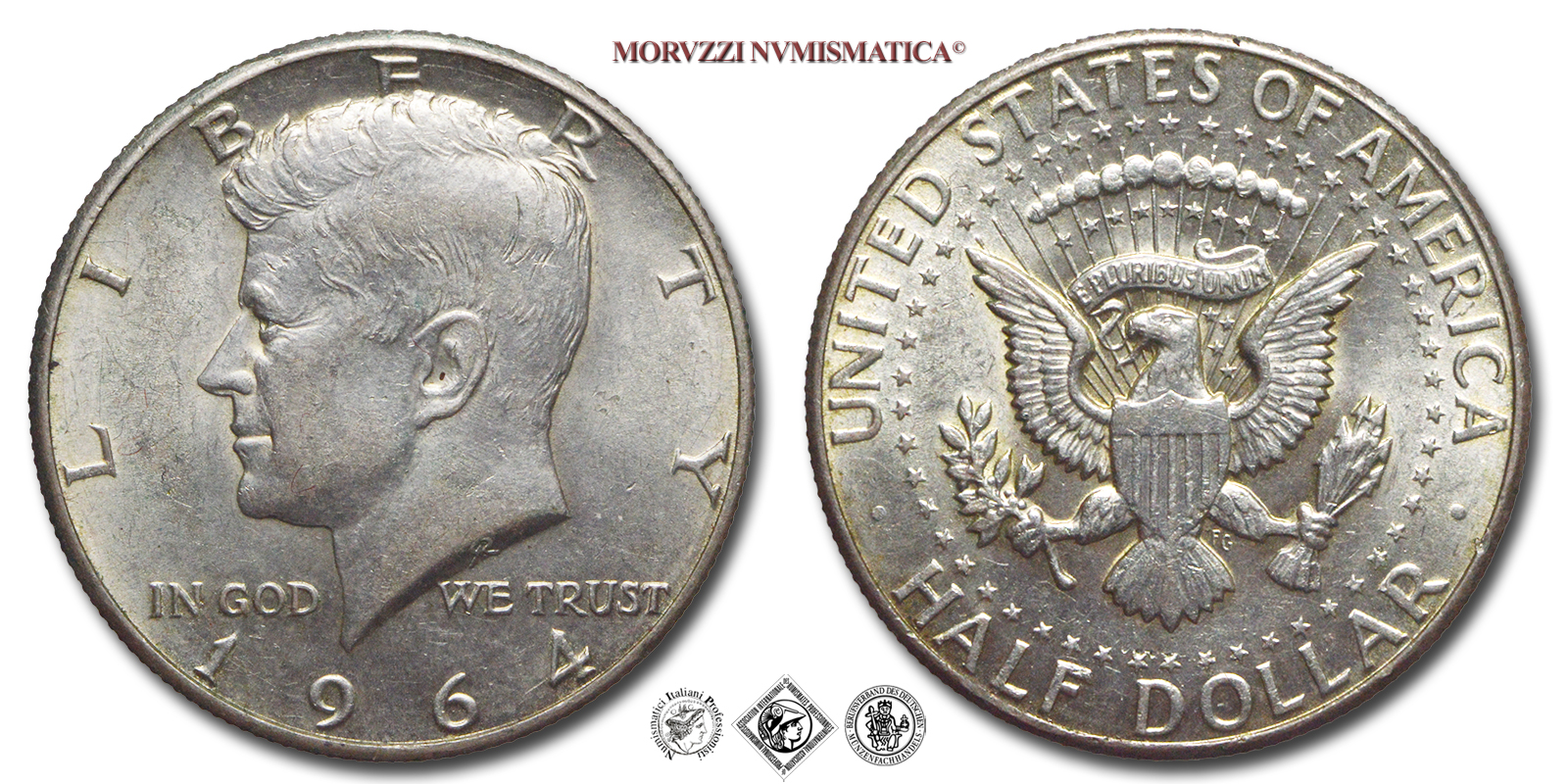 Stati Uniti d'America, DOLLARO 1/2, Kennedy, Emissione: 1964, D/ LIBERTY, Ritratto di John F. Kennedy a sinistra; nel campo, ai lati: IN GOD WE TRUST; sul troncamento del collo: la sigla dell'incisore (GR per Gilroy Roberts); in basso: data (1964), R/ UNITED STATES OF AMERICA, Sigillo presidenziale modificato degli Stati Uniti d'America: uno scudo (con strisce verticali) sul petto di un'aquila americana. L'aquila regge con l'artiglio destro un ramoscello d'ulivo e con quello sinistro un fascio di tredici frecce e nel becco un cartiglio con la scritta "E PLURIBUS UNUM". Un cerchio di stelle circonda l'aquila; nel campo: la sigla dell'incisore (FG per Frank Gasparro); in basso: il valore (HALF DOLLAR), Zecca di Philadelphia, Rif. bibl. KM, 202; Metallo: AR, gr. 12,45, (ME156578), Diam.: mm. 30,57, qFDC