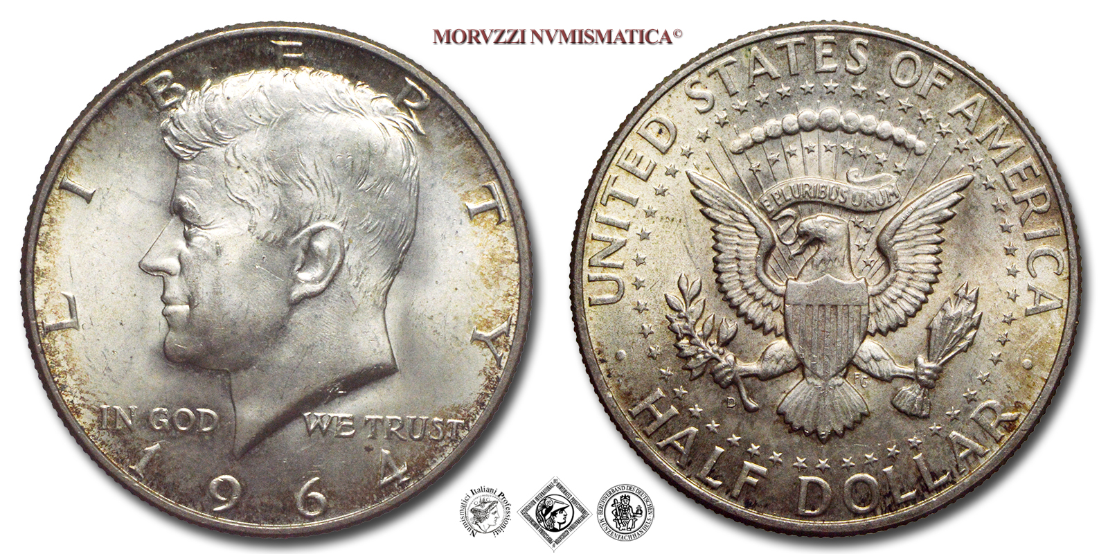 Stati Uniti d'America, DOLLARO 1/2, Kennedy, Emissione: 1964, D/ LIBERTY, Ritratto di John F. Kennedy a sinistra; nel campo, ai lati: IN GOD WE TRUST; sul troncamento del collo: la sigla dell'incisore (GR per Gilroy Roberts); in basso: data (1964), R/ UNITED STATES OF AMERICA, Sigillo presidenziale modificato degli Stati Uniti d'America: uno scudo (con strisce verticali) sul petto di un'aquila americana. L'aquila regge con l'artiglio destro un ramoscello d'ulivo e con quello sinistro un fascio di tredici frecce e nel becco un cartiglio con la scritta "E PLURIBUS UNUM". Un cerchio di stelle circonda l'aquila; nel campo: la sigla dell'incisore (FG per Frank Gasparro); in basso: il valore (HALF DOLLAR), Zecca di Philadelphia, Rif. bibl. KM, 202; Metallo: AR, gr. 12,41, (ME156580), Diam.: mm. 30,60, qFDC