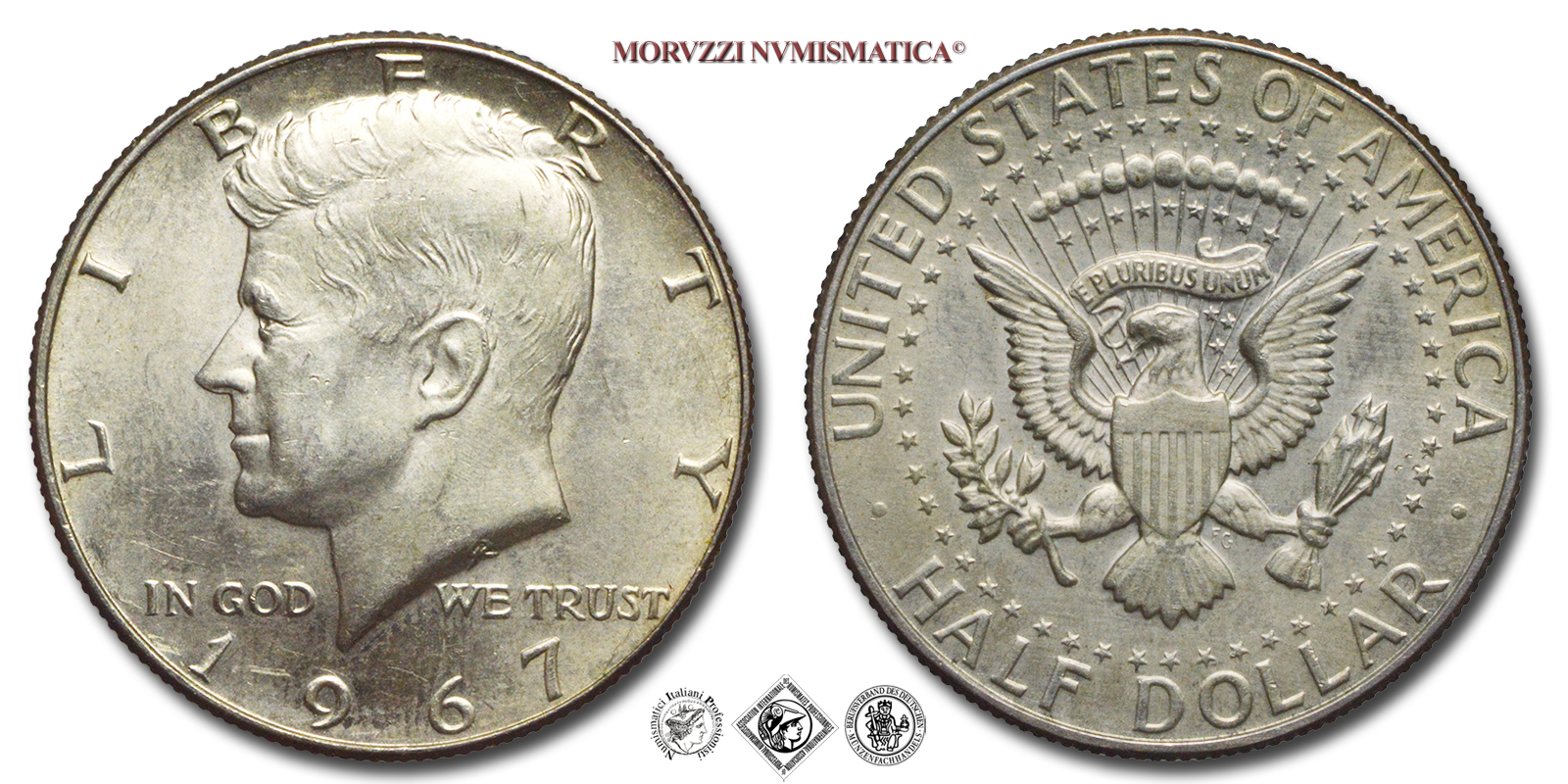 Stati Uniti d'America, DOLLARO 1/2, Kennedy, Emissione: 1967, D/ LIBERTY, Ritratto di John F. Kennedy a sinistra; nel campo, ai lati: IN GOD WE TRUST; sul troncamento del collo: la sigla dell'incisore (GR per Gilroy Roberts); in basso: data (1967), R/ UNITED STATES OF AMERICA, Sigillo presidenziale modificato degli Stati Uniti d'America: uno scudo (con strisce verticali) sul petto di un'aquila americana. L'aquila regge con l'artiglio destro un ramoscello d'ulivo e con quello sinistro un fascio di tredici frecce e nel becco un cartiglio con la scritta "E PLURIBUS UNUM". Un cerchio di stelle circonda l'aquila; nel campo: la sigla dell'incisore (FG per Frank Gasparro); in basso: il valore (HALF DOLLAR), Zecca di Philadelphia, Rif. bibl. KM, 202a; Metallo: AR, gr. 11,56, (ME161130), Diam.: mm. 30,65, FDC