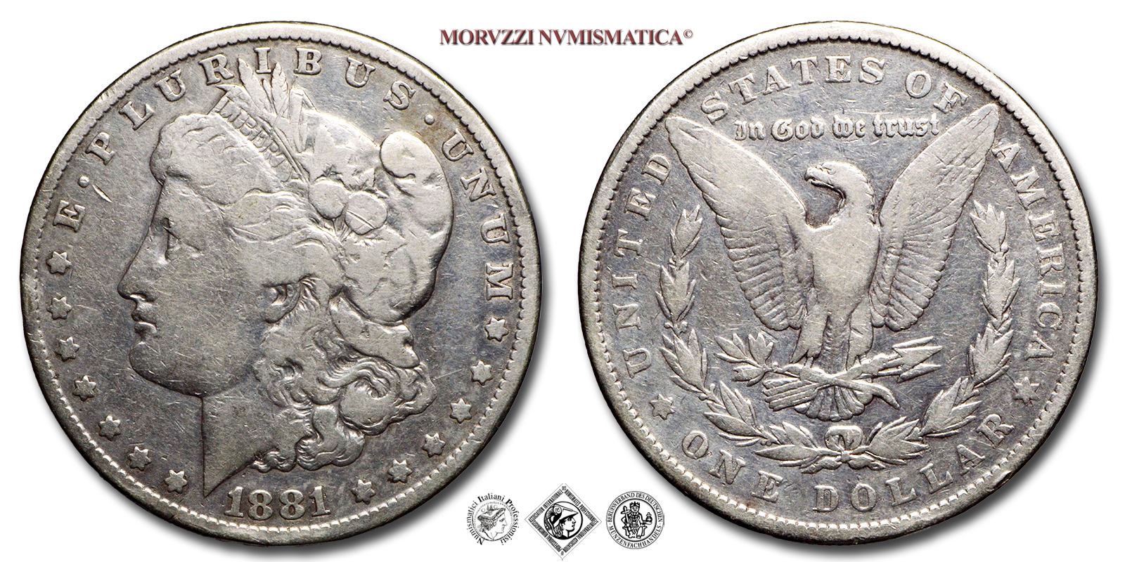 Stati Uniti d'America, USA, DOLLARO, Morgan, Emissione: 1881, D/ E · PLURIBUS · UNUM LIBERTY 1881, Testa della Libertà a sinistra. Incisore: George T. Morgan, R/ UNITED STATES OF AMERICA In God we trust * ONE DOLLAR *, Aquila con frecce e ramo d'ulivo, entro ghirlanda. Incisore: George T. Morgan, Zecca di Philadelphia, Rif. bibl. KM, 110; Metallo: AR, gr. 26,12, (ME161216), Diam.: mm. 37,85, mB