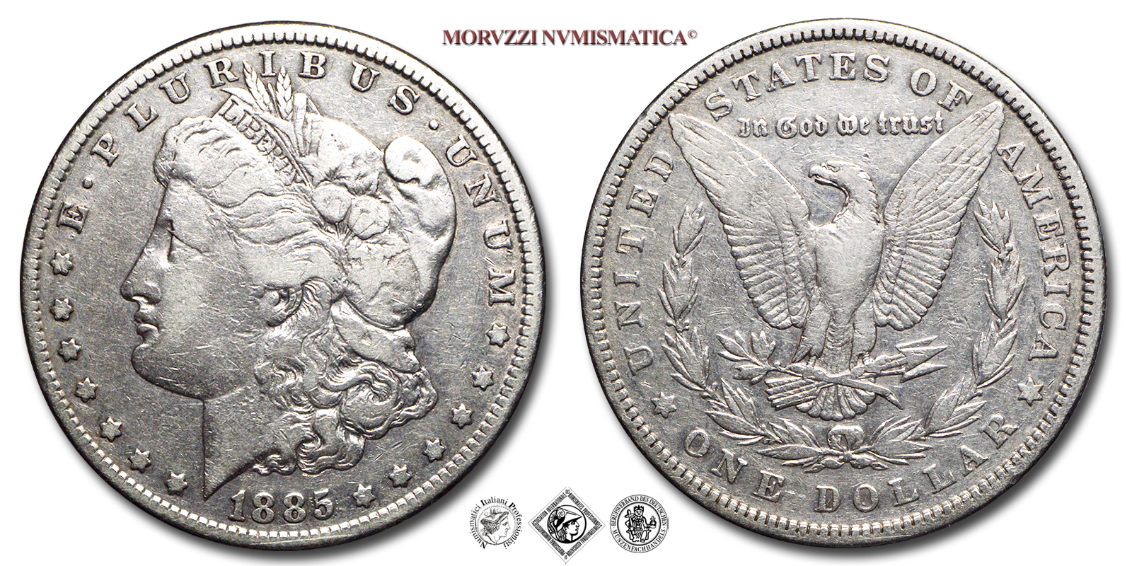 Stati Uniti d'America, USA, DOLLARO, Morgan, Emissione: 1885, D/ E · PLURIBUS · UNUM LIBERTY 1885, Testa della Libertà a sinistra. Incisore: George T. Morgan, R/ UNITED STATES OF AMERICA In God we trust * ONE DOLLAR *, Aquila con frecce e ramo d'ulivo, entro ghirlanda. Incisore: George T. Morgan, Zecca di Philadelphia, Rif. bibl. KM, 110; Metallo: AR, gr. 26,40, (ME161215), Diam.: mm. 38,10, qBB