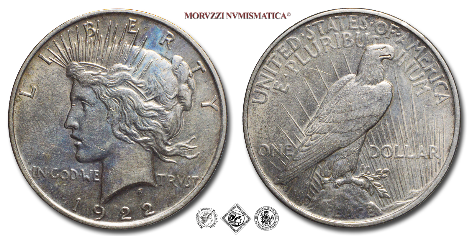 Stati Uniti d'America, USA, DOLLARO, Peace, Emissione: 1922, D/ Grande testa della Libertà volta a sinistra, modellata sulle sembianze di Teresa Caffarelli De Francisci, moglie dell'incisore Anthony De Francisci. I suoi lunghi capelli sono pettinati all'indietro e le trecce sono avvolte in una crocchia alla sommità della testa. Diverse ciocche di capelli sono sciolte e spinte all'indietro. Sulla sua testa un diadema che proietta raggi di luce - la libertà di pensiero - nel mondo. Al disopra della testa, parzialmente coperta dai raggi, la parola LIBERTY. Il motto è posto orizzontalmente, con il collo della Libertà a dividere la frase IN GOD WE - TRUST. Alla base del conio, la data (1922), R/ Aquila volta a destra, poggiante su una montagna, le ali ripiegate, che guarda verso i raggi di una nuova alba di pace, stringendo negli artigli un ramo d'ulivo. Lungo il bordo superiore, avvolgente parzialmente l'aquila, UNITED STATES OF AMERICA e appena sotto il motto E PLURIBUS UNUM. Valore ONE - DOLLAR ripartito orizzontalmente tra le zampe dell'aquila, e nel bordo inferiore, sotto la montagna, la parola PEACE. Sotto la O di ONE, se presente, il segno di zecca, Zecca di Philadelphia, Rif. bibl. KM, 150; Metallo: AR, gr. 26,79, (ME161221), Diam.: mm. 38,14, mBB