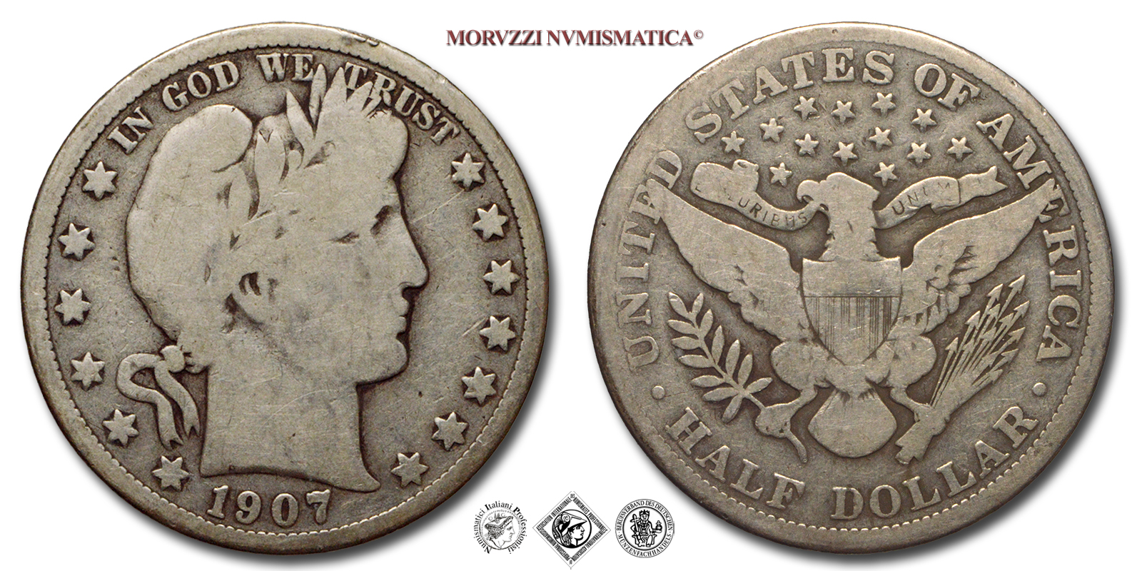 Stati Uniti d'America, USA, DOLLARO 1/2, Barber, Emissione: 1907, D/ IN GOD WE TRUST B 1907, Busto della Libertà a destra, 13 stelle intorno. Incisore: Charles Edward Barber, R/ UNITED STATES OF AMERICA E PLURIBUS UNUM, Aquila araldica con 13 stelle sopra e la denominazione (HALF DOLLAR) sotto. Disegnatore: Charles Edward Barber, Zecca di Philadelphia, Rif. bibl. KM, 116; Metallo: AR, gr. 11,80, (ME154804), Diam.: mm. 30,59, MB