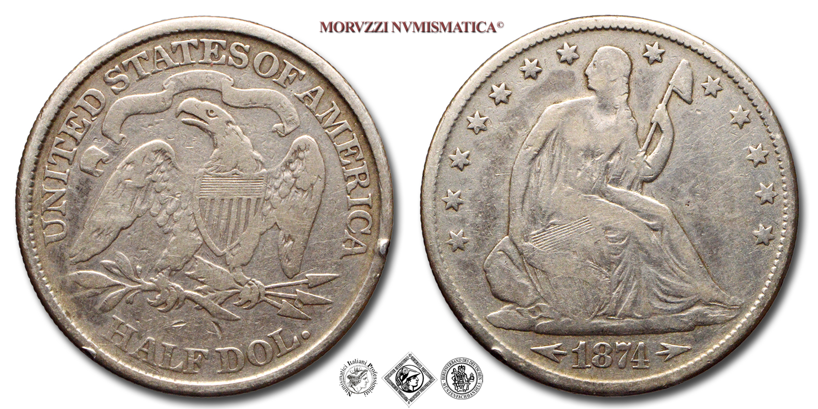 Stati Uniti d'America, USA, DOLLARO 1/2, Seated Liberty, Emissione: 1874, D/ Libertà seduta guarda a destra sopra la spalla, con un berretto su un bastone e uno scudo, 13 stelle intorno. Incisore: Christian Gobrecht, R/ UNITED STATES OF AMERICA HALF DOL., Aquila con frecce e ramo d'ulivo negli artigli. Disegnatore: Christian Gobrecht, Zecca di Philadelphia, Rif. bibl. KM, A68; Metallo: AR, gr. 12,23, (ME154798), Diam.: mm. 30,55, MB