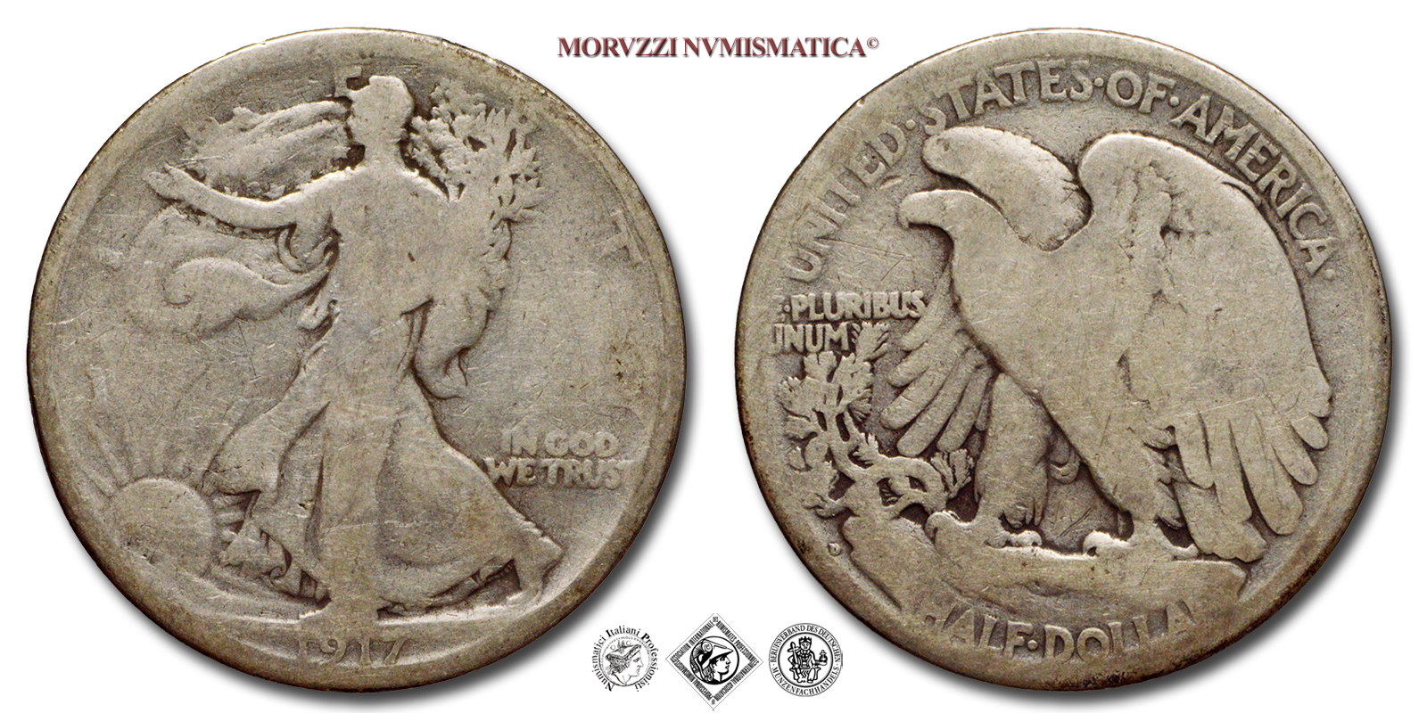 Stati Uniti d'America, USA, DOLLARO 1/2, Walking Liberty, Emissione: 1917, D/ LIBERTY, Libertà andante a sinistra; sotto: data (1917); nel campo, a destra: IN GOD / WE TRUST. Incisore: Adolph Alexander Weinman, R/ UNITED·STATES·oF·AMERICA, Aquila ad ali spiegate; sotto: valore (HALF·DOLLAR) e inziali dell'incisore (AAW per Adolph Alexander Weinman); nel campo, a sinistra: E·PLURIBUS / UNUM, Zecca di Philadelphia, Rif. bibl. KM, 142; Metallo: AR, gr. 11,96, (ME154817), Diam.: mm. 30,40, B