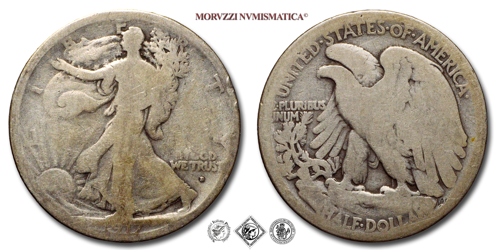 Stati Uniti d'America, USA, DOLLARO 1/2, Walking Liberty, Emissione: 1917, D/ LIBERTY, Libertà andante a sinistra; sotto: data (1917); nel campo, a destra: IN GOD / WE TRUST. Incisore: Adolph Alexander Weinman, R/ UNITED·STATES·oF·AMERICA, Aquila ad ali spiegate; sotto: valore (HALF·DOLLAR) e inziali dell'incisore (AAW per Adolph Alexander Weinman); nel campo, a sinistra: E·PLURIBUS / UNUM, Zecca di Philadelphia, Rif. bibl. KM, 142; Metallo: AR, gr. 11,96, (ME154820), Diam.: mm. 30,40, B