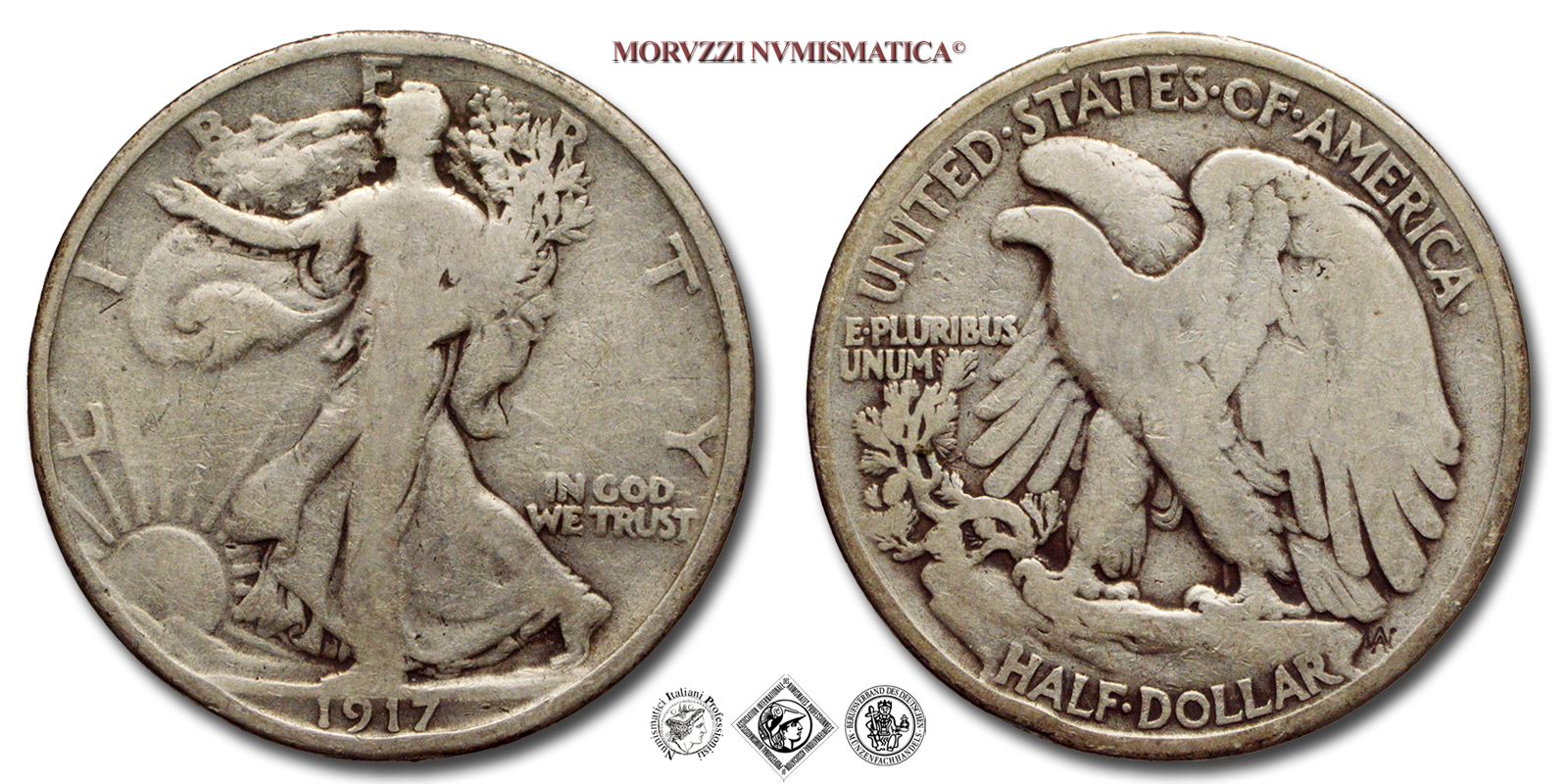 Stati Uniti d'America, USA, DOLLARO 1/2, Walking Liberty, Emissione: 1917, D/ LIBERTY, Libertà andante a sinistra; sotto: data (1917); nel campo, a destra: IN GOD / WE TRUST. Incisore: Adolph Alexander Weinman, R/ UNITED·STATES·oF·AMERICA, Aquila ad ali spiegate; sotto: valore (HALF·DOLLAR) e inziali dell'incisore (AAW per Adolph Alexander Weinman); nel campo, a sinistra: E·PLURIBUS / UNUM, Zecca di Philadelphia, Rif. bibl. KM, 142; Metallo: AR, gr. 12,08, (ME154819), Diam.: mm. 30,43, B