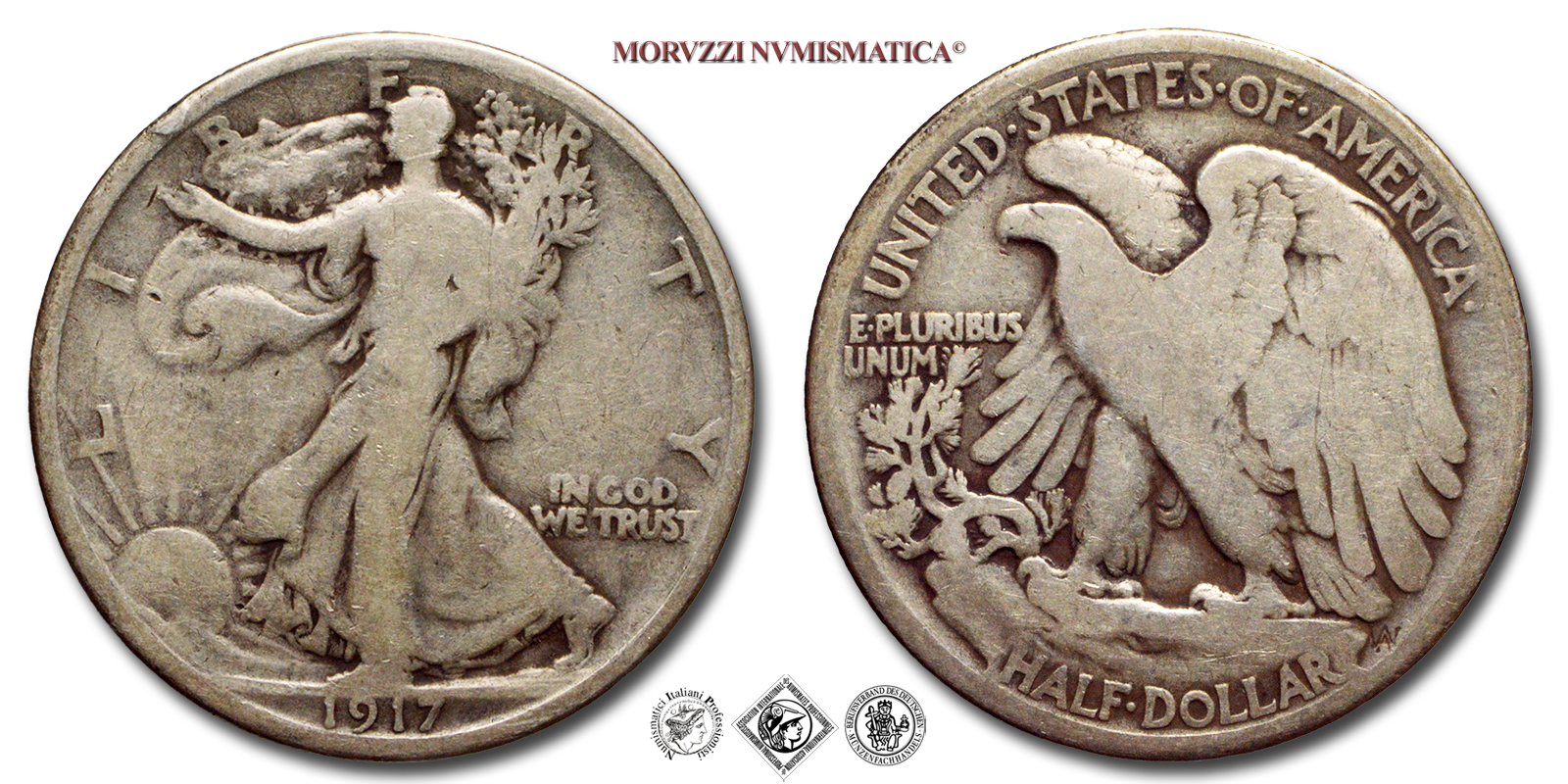 Stati Uniti d'America, USA, DOLLARO 1/2, Walking Liberty, Emissione: 1917, D/ LIBERTY, Libertà andante a sinistra; sotto: data (1917); nel campo, a destra: IN GOD / WE TRUST. Incisore: Adolph Alexander Weinman, R/ UNITED·STATES·oF·AMERICA, Aquila ad ali spiegate; sotto: valore (HALF·DOLLAR) e inziali dell'incisore (AAW per Adolph Alexander Weinman); nel campo, a sinistra: E·PLURIBUS / UNUM, Zecca di Philadelphia, Rif. bibl. KM, 142; Metallo: AR, gr. 12,00, (ME154816), Diam.: mm. 30,44, MB