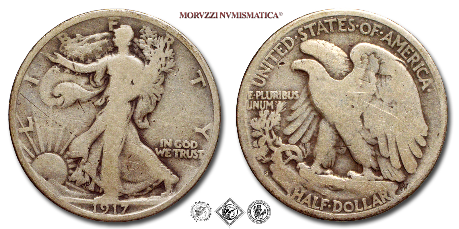 Stati Uniti d'America, USA, DOLLARO 1/2, Walking Liberty, Emissione: 1917, D/ LIBERTY, Libertà andante a sinistra; sotto: data (1917); nel campo, a destra: IN GOD / WE TRUST. Incisore: Adolph Alexander Weinman, R/ UNITED·STATES·oF·AMERICA, Aquila ad ali spiegate; sotto: valore (HALF·DOLLAR) e inziali dell'incisore (AAW per Adolph Alexander Weinman); nel campo, a sinistra: E·PLURIBUS / UNUM, Zecca di Philadelphia, Rif. bibl. KM, 142; Metallo: AR, gr. 11,90, (ME154815), Diam.: mm. 30,36, MB