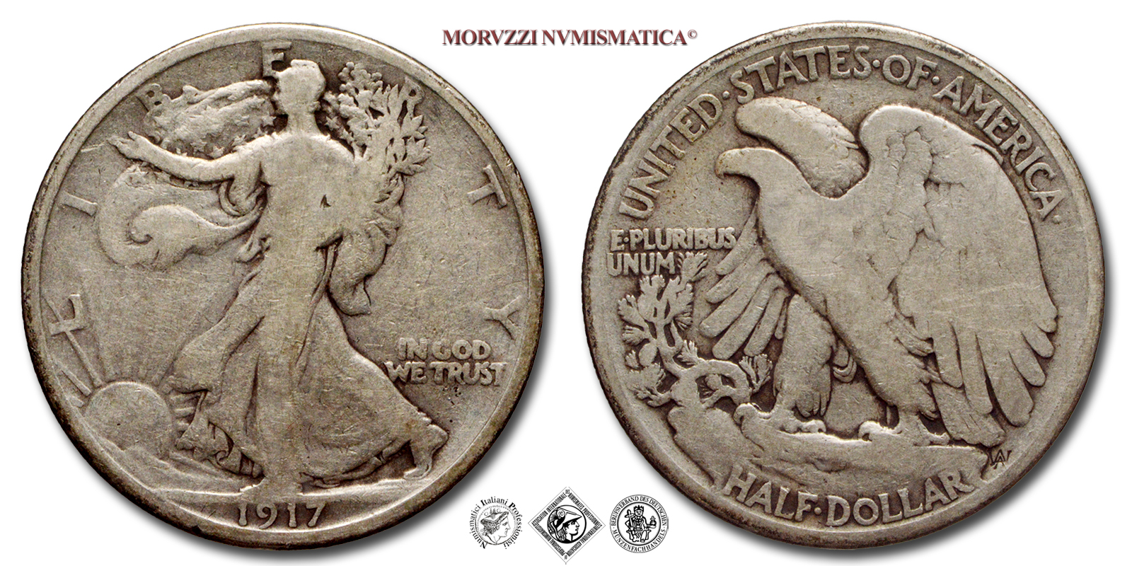 Stati Uniti d'America, USA, DOLLARO 1/2, Walking Liberty, Emissione: 1917, D/ LIBERTY, Libertà andante a sinistra; sotto: data (1917); nel campo, a destra: IN GOD / WE TRUST. Incisore: Adolph Alexander Weinman, R/ UNITED·STATES·oF·AMERICA, Aquila ad ali spiegate; sotto: valore (HALF·DOLLAR) e inziali dell'incisore (AAW per Adolph Alexander Weinman); nel campo, a sinistra: E·PLURIBUS / UNUM, Zecca di Philadelphia, Rif. bibl. KM, 142; Metallo: AR, gr. 12,06, (ME154814), Diam.: mm. 30,43, mB