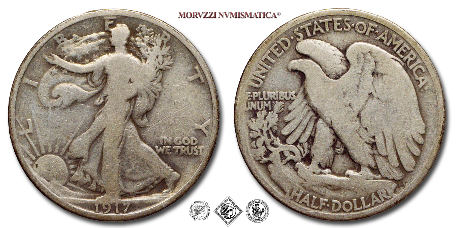 Stati Uniti d'America, USA, DOLLARO 1/2, Walking Liberty, Emissione: 1917, D/ LIBERTY, Libertà andante a sinistra; sotto: data (1917); nel campo, a destra: IN GOD / WE TRUST. Incisore: Adolph Alexander Weinman, R/ UNITED·STATES·oF·AMERICA, Aquila ad ali spiegate; sotto: valore (HALF·DOLLAR) e inziali dell'incisore (AAW per Adolph Alexander Weinman); nel campo, a sinistra: E·PLURIBUS / UNUM, Zecca di Philadelphia, Rif. bibl. KM, 142; Metallo: AR, gr. 11,96, (ME154818), Diam.: mm. 30,40, MB