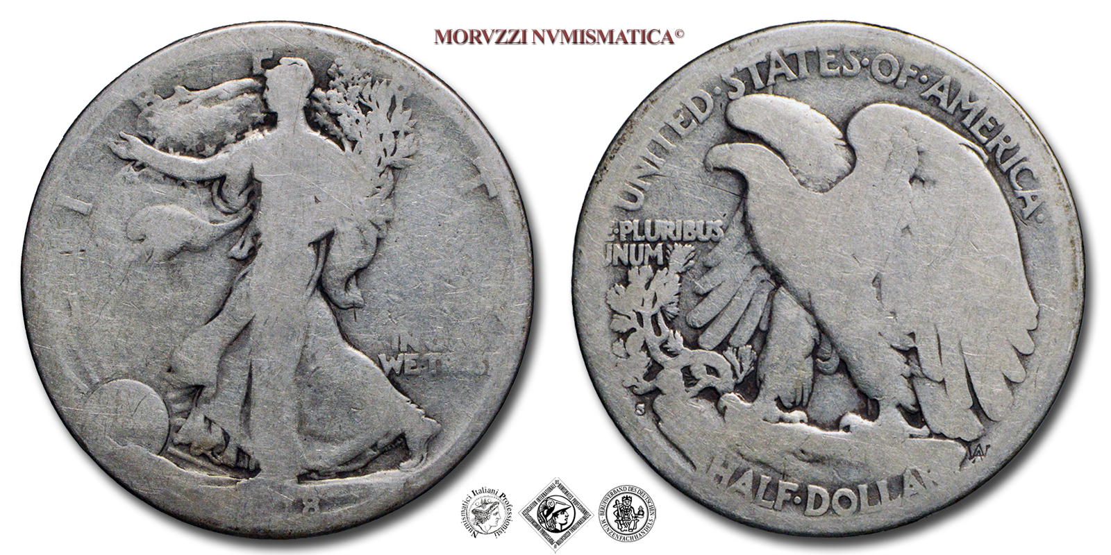 Stati Uniti d'America, USA, DOLLARO 1/2, Walking Liberty, Emissione: 1918, D/ LIBERTY, Libertà andante a sinistra; sotto: data (1918); nel campo, a destra: IN GOD / WE TRUST. Incisore: Adolph Alexander Weinman, R/ UNITED·STATES·oF·AMERICA, Aquila ad ali spiegate; sotto: valore (HALF·DOLLAR) e inziali dell'incisore (AAW per Adolph Alexander Weinman); nel campo, a sinistra: E·PLURIBUS / UNUM, Zecca di Philadelphia, Rif. bibl. KM, 142; Metallo: AR, gr. 11,75, (ME154876), Diam.: mm. 30,37, B