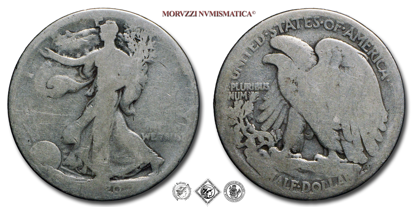 Stati Uniti d'America, USA, DOLLARO 1/2, Walking Liberty, Emissione: 1920, D/ LIBERTY, Libertà andante a sinistra; sotto: data (1920); nel campo, a destra: IN GOD / WE TRUST. Incisore: Adolph Alexander Weinman, R/ UNITED·STATES·oF·AMERICA, Aquila ad ali spiegate; sotto: valore (HALF·DOLLAR) e inziali dell'incisore (AAW per Adolph Alexander Weinman); nel campo, a sinistra: E·PLURIBUS / UNUM, Zecca di Philadelphia, Rif. bibl. KM, 142; Metallo: AR, gr. 11,63, (ME154881), Diam.: mm. 30,34, B