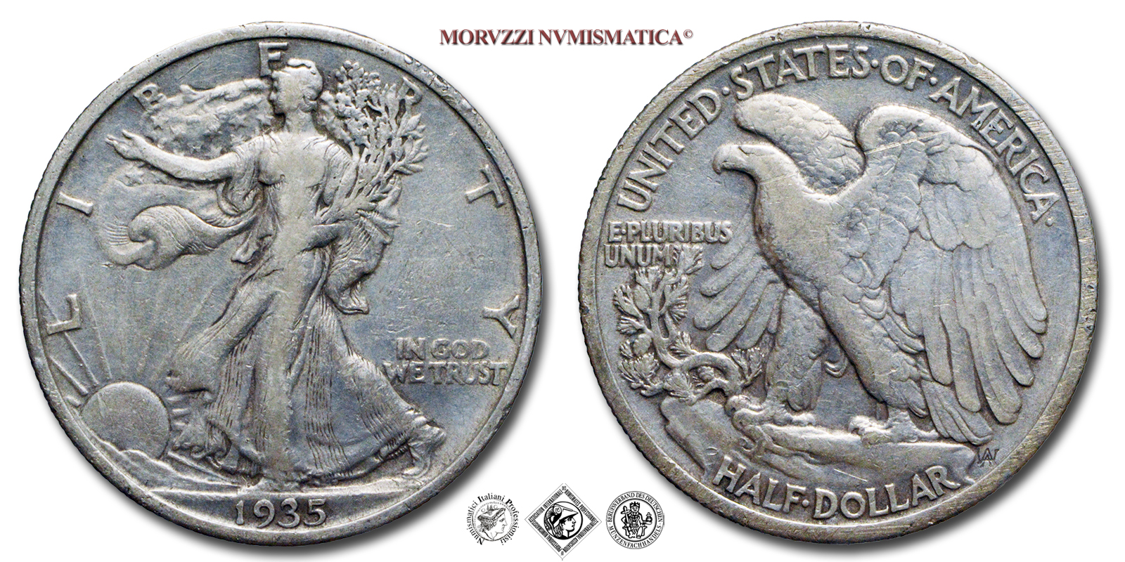 Stati Uniti d'America, USA, DOLLARO 1/2, Walking Liberty, Emissione: 1935, D/ LIBERTY, Libertà andante a sinistra; sotto: data (1935); nel campo, a destra: IN GOD / WE TRUST. Incisore: Adolph Alexander Weinman, R/ UNITED·STATES·oF·AMERICA, Aquila ad ali spiegate; sotto: valore (HALF·DOLLAR) e inziali dell'incisore (AAW per Adolph Alexander Weinman); nel campo, a sinistra: E·PLURIBUS / UNUM, Zecca di Philadelphia, Rif. bibl. KM, 142; Metallo: AR, gr. 12,39, (ME154846), Diam.: mm. 30,48, MB