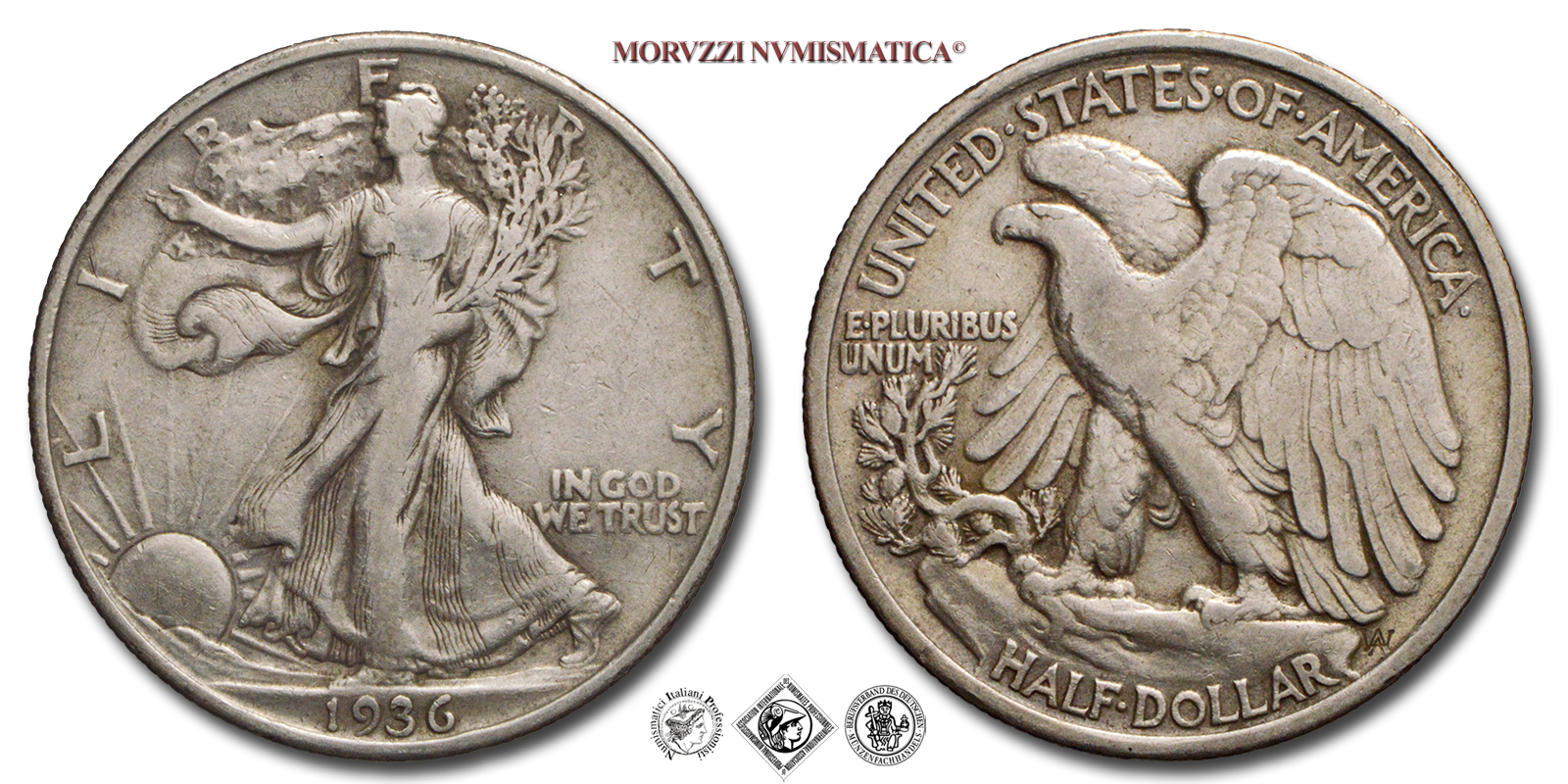 Stati Uniti d'America, USA, DOLLARO 1/2, Walking Liberty, Emissione: 1936, D/ LIBERTY, Libertà andante a sinistra; sotto: data (1936); nel campo, a destra: IN GOD / WE TRUST. Incisore: Adolph Alexander Weinman, R/ UNITED·STATES·oF·AMERICA, Aquila ad ali spiegate; sotto: valore (HALF·DOLLAR) e inziali dell'incisore (AAW per Adolph Alexander Weinman); nel campo, a sinistra: E·PLURIBUS / UNUM, Zecca di Philadelphia, Rif. bibl. KM, 142; Metallo: AR, gr. 12,41, (ME154851), Diam.: mm. 30,49, qBB