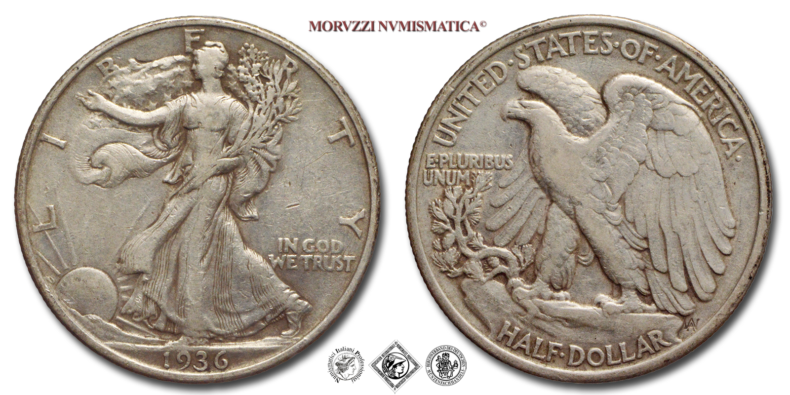 Stati Uniti d'America, USA, DOLLARO 1/2, Walking Liberty, Emissione: 1936, D/ LIBERTY, Libertà andante a sinistra; sotto: data (1936); nel campo, a destra: IN GOD / WE TRUST. Incisore: Adolph Alexander Weinman, R/ UNITED·STATES·oF·AMERICA, Aquila ad ali spiegate; sotto: valore (HALF·DOLLAR) e inziali dell'incisore (AAW per Adolph Alexander Weinman); nel campo, a sinistra: E·PLURIBUS / UNUM, Zecca di Philadelphia, Rif. bibl. KM, 142; Metallo: AR, gr. 12,38, (ME154853), Diam.: mm. 30,46, BB