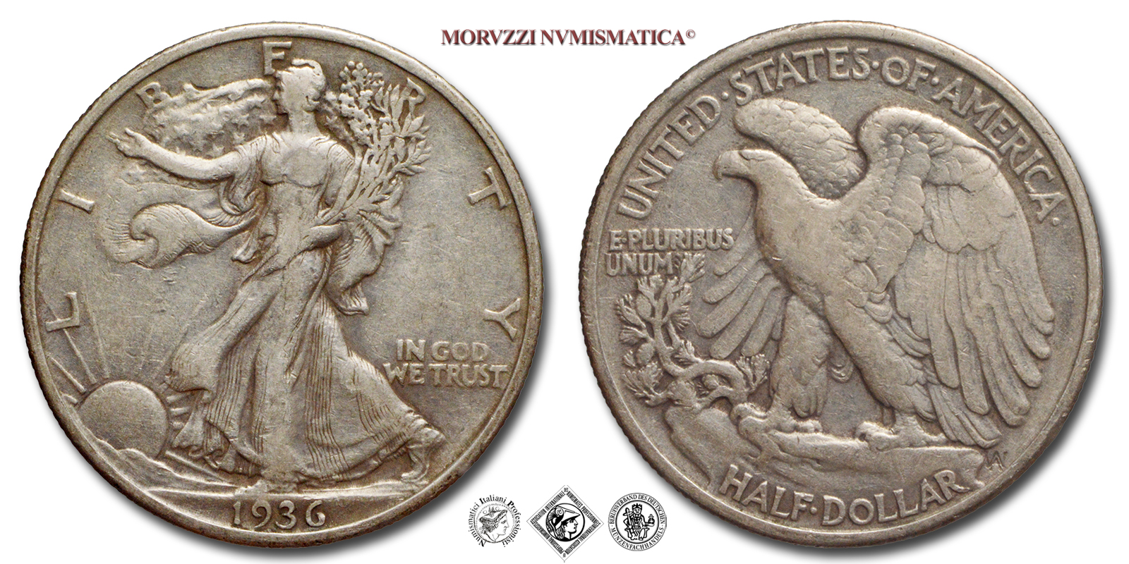 Stati Uniti d'America, USA, DOLLARO 1/2, Walking Liberty, Emissione: 1936, D/ LIBERTY, Libertà andante a sinistra; sotto: data (1936); nel campo, a destra: IN GOD / WE TRUST. Incisore: Adolph Alexander Weinman, R/ UNITED·STATES·oF·AMERICA, Aquila ad ali spiegate; sotto: valore (HALF·DOLLAR) e inziali dell'incisore (AAW per Adolph Alexander Weinman); nel campo, a sinistra: E·PLURIBUS / UNUM, Zecca di Philadelphia, Rif. bibl. KM, 142; Metallo: AR, gr. 12,43, (ME154855), Diam.: mm. 30,47, MB