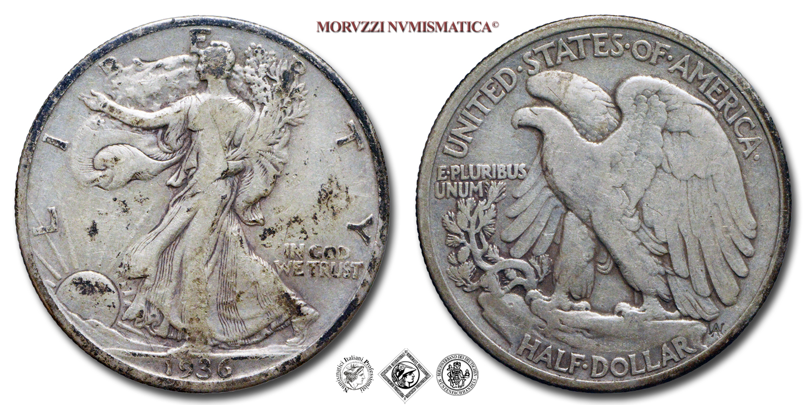 Stati Uniti d'America, USA, DOLLARO 1/2, Walking Liberty, Emissione: 1936, D/ LIBERTY, Libertà andante a sinistra; sotto: data (1936); nel campo, a destra: IN GOD / WE TRUST. Incisore: Adolph Alexander Weinman, R/ UNITED·STATES·oF·AMERICA, Aquila ad ali spiegate; sotto: valore (HALF·DOLLAR) e inziali dell'incisore (AAW per Adolph Alexander Weinman); nel campo, a sinistra: E·PLURIBUS / UNUM, Zecca di Philadelphia, Rif. bibl. KM, 142; Metallo: AR, gr. 12,28, (ME154850), Diam.: mm. 30,44, MB