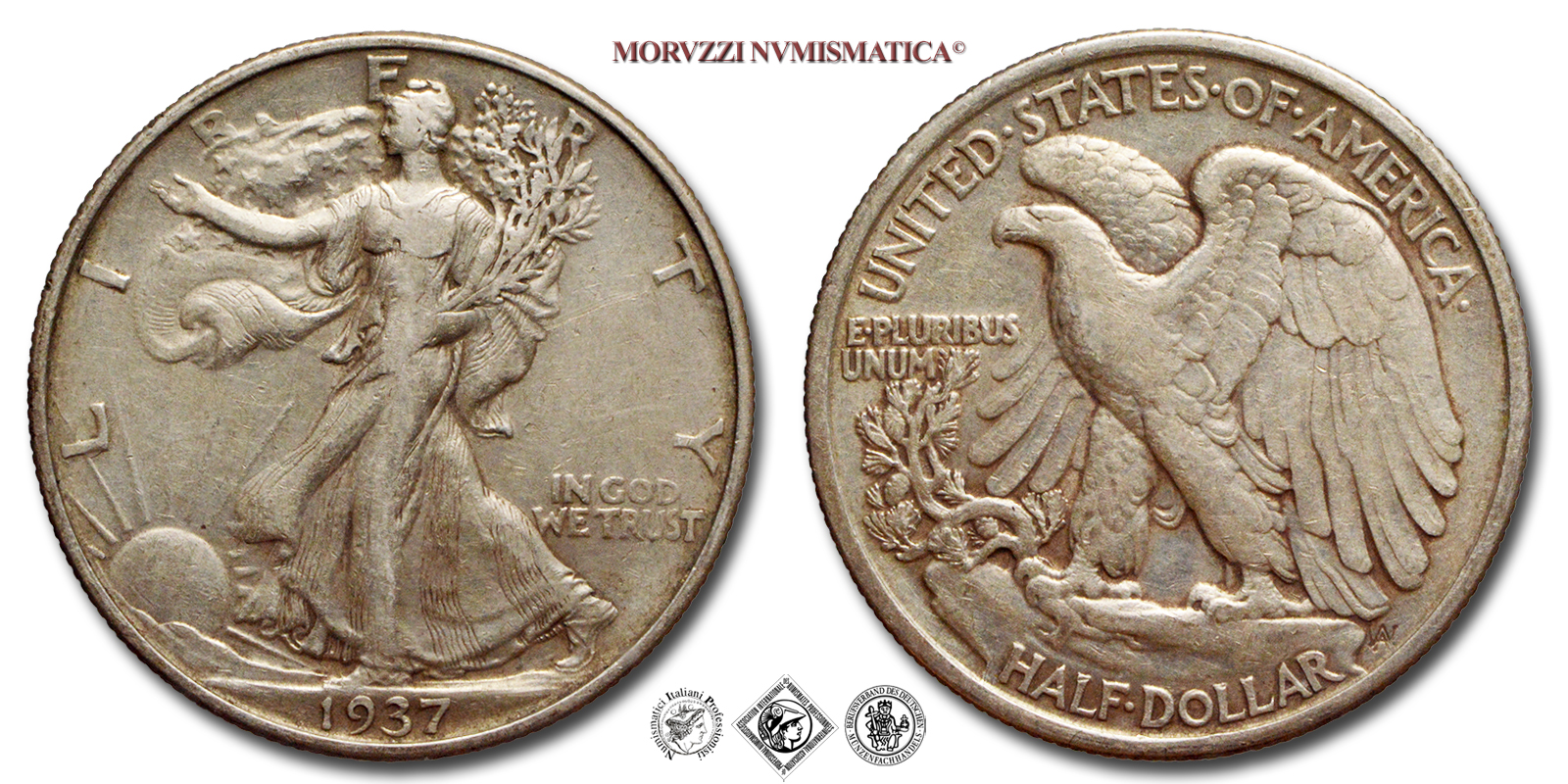 Stati Uniti d'America, USA, DOLLARO 1/2, Walking Liberty, Emissione: 1937, D/ LIBERTY, Libertà andante a sinistra; sotto: data (1937); nel campo, a destra: IN GOD / WE TRUST. Incisore: Adolph Alexander Weinman, R/ UNITED·STATES·oF·AMERICA, Aquila ad ali spiegate; sotto: valore (HALF·DOLLAR) e inziali dell'incisore (AAW per Adolph Alexander Weinman); nel campo, a sinistra: E·PLURIBUS / UNUM, Zecca di Philadelphia, Rif. bibl. KM, 142; Metallo: AR, gr. 12,48, (ME154856), Diam.: mm. 30,52, MB