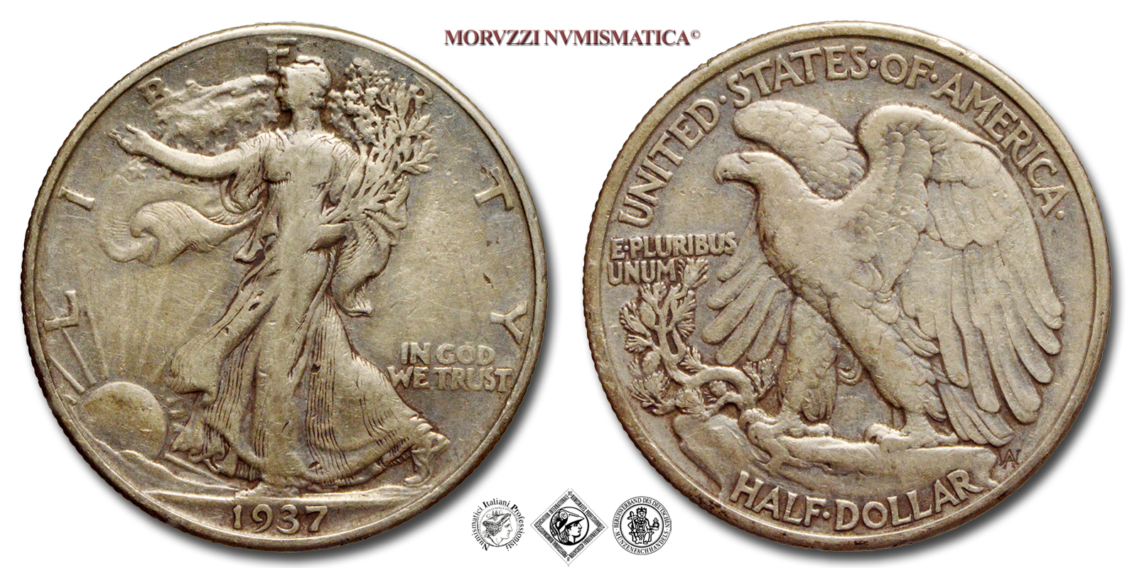Stati Uniti d'America, USA, DOLLARO 1/2, Walking Liberty, Emissione: 1937, D/ LIBERTY, Libertà andante a sinistra; sotto: data (1937); nel campo, a destra: IN GOD / WE TRUST. Incisore: Adolph Alexander Weinman, R/ UNITED·STATES·oF·AMERICA, Aquila ad ali spiegate; sotto: valore (HALF·DOLLAR) e inziali dell'incisore (AAW per Adolph Alexander Weinman); nel campo, a sinistra: E·PLURIBUS / UNUM, Zecca di Philadelphia, Rif. bibl. KM, 142; Metallo: AR, gr. 12,45, (ME154863), Diam.: mm. 30,48, MB