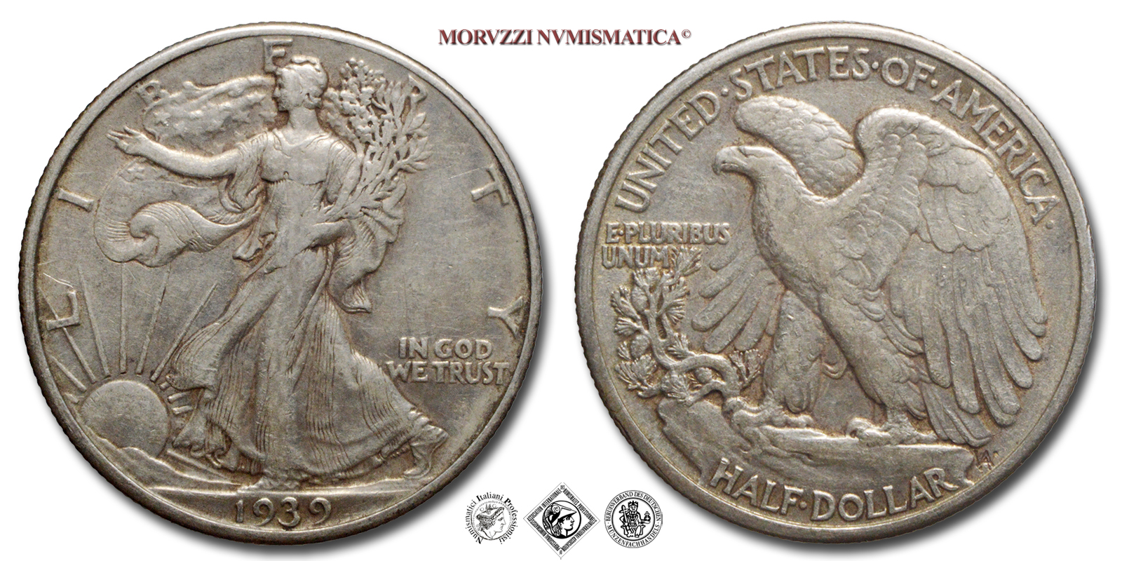 Stati Uniti d'America, USA, DOLLARO 1/2, Walking Liberty, Emissione: 1939, D/ LIBERTY, Libertà andante a sinistra; sotto: data (1939); nel campo, a destra: IN GOD / WE TRUST. Incisore: Adolph Alexander Weinman, R/ UNITED·STATES·oF·AMERICA, Aquila ad ali spiegate; sotto: valore (HALF·DOLLAR) e inziali dell'incisore (AAW per Adolph Alexander Weinman); nel campo, a sinistra: E·PLURIBUS / UNUM, Zecca di Philadelphia, Rif. bibl. KM, 142; Metallo: AR, gr. 12,39, (ME154901), Diam.: mm. 30,51, BB