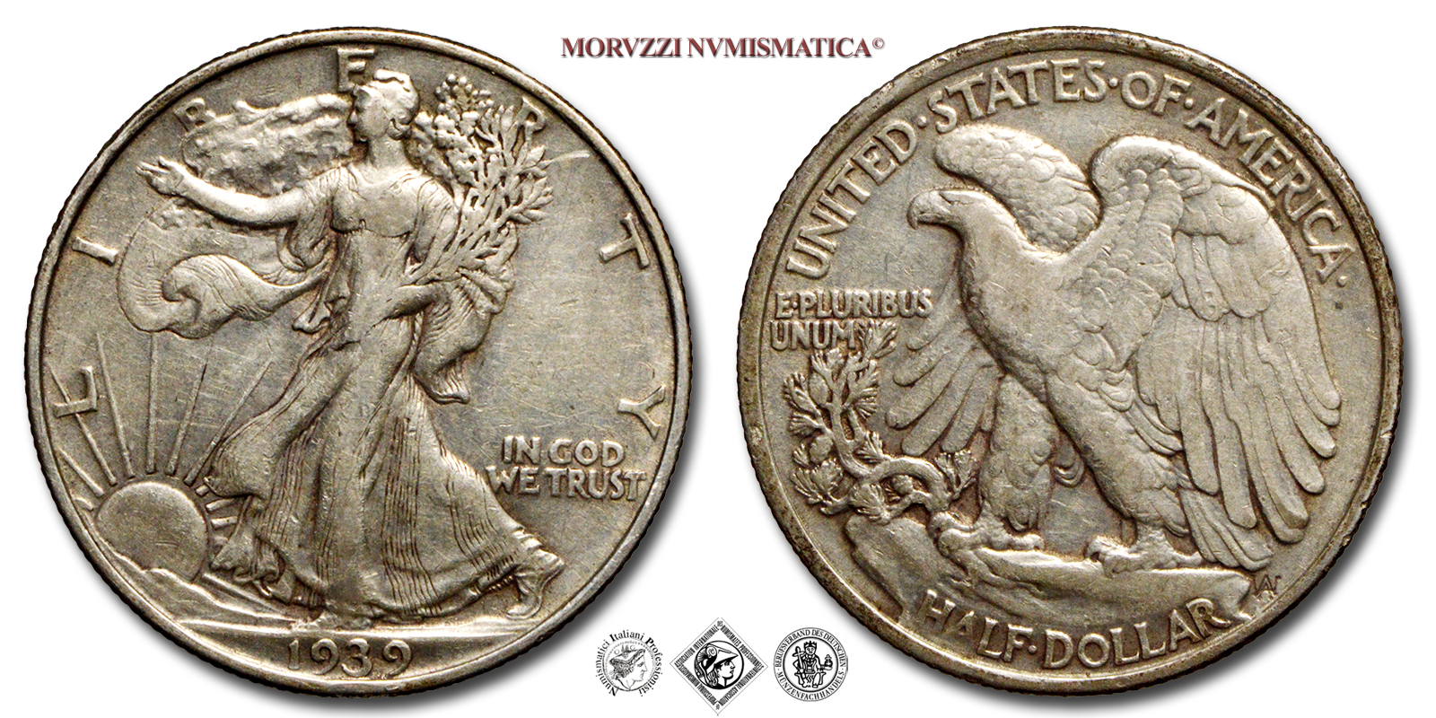 Stati Uniti d'America, USA, DOLLARO 1/2, Walking Liberty, Emissione: 1939, D/ LIBERTY, Libertà andante a sinistra; sotto: data (1939); nel campo, a destra: IN GOD / WE TRUST. Incisore: Adolph Alexander Weinman, R/ UNITED·STATES·oF·AMERICA, Aquila ad ali spiegate; sotto: valore (HALF·DOLLAR) e inziali dell'incisore (AAW per Adolph Alexander Weinman); nel campo, a sinistra: E·PLURIBUS / UNUM, Zecca di Philadelphia, Rif. bibl. KM, 142; Metallo: AR, gr. 12,39, (ME154884), Diam.: mm. 30,48, BB